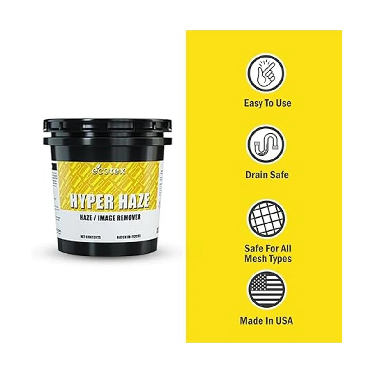 Simple y fácil de usar: Ecotex Hyper Haze elimina fácilmente todas las manchas, aceites y residuos de tinta Plastisol. Esta fórmula dos en uno también desengrasará tu malla de serigrafía en un solo paso. Simplemente límpialo, déjalo reposar durante 1 minuto y lávalo.