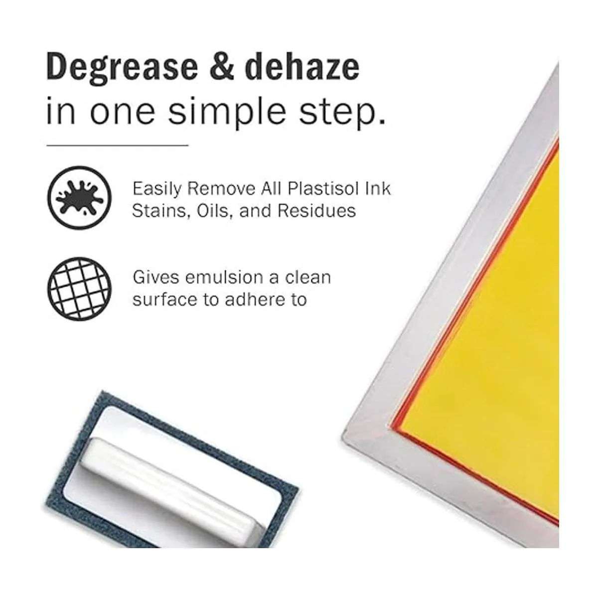 Limpiador respetuoso con el medio ambiente: nuestro removedor de niebla de serigrafía de seda es biodegradable y seguro en tu malla de serigrafía. Seguro para drenaje, no peligroso y no corrosivo. Siéntete libre de usar donde sea necesario y no te preocupes por productos químicos desagradables.