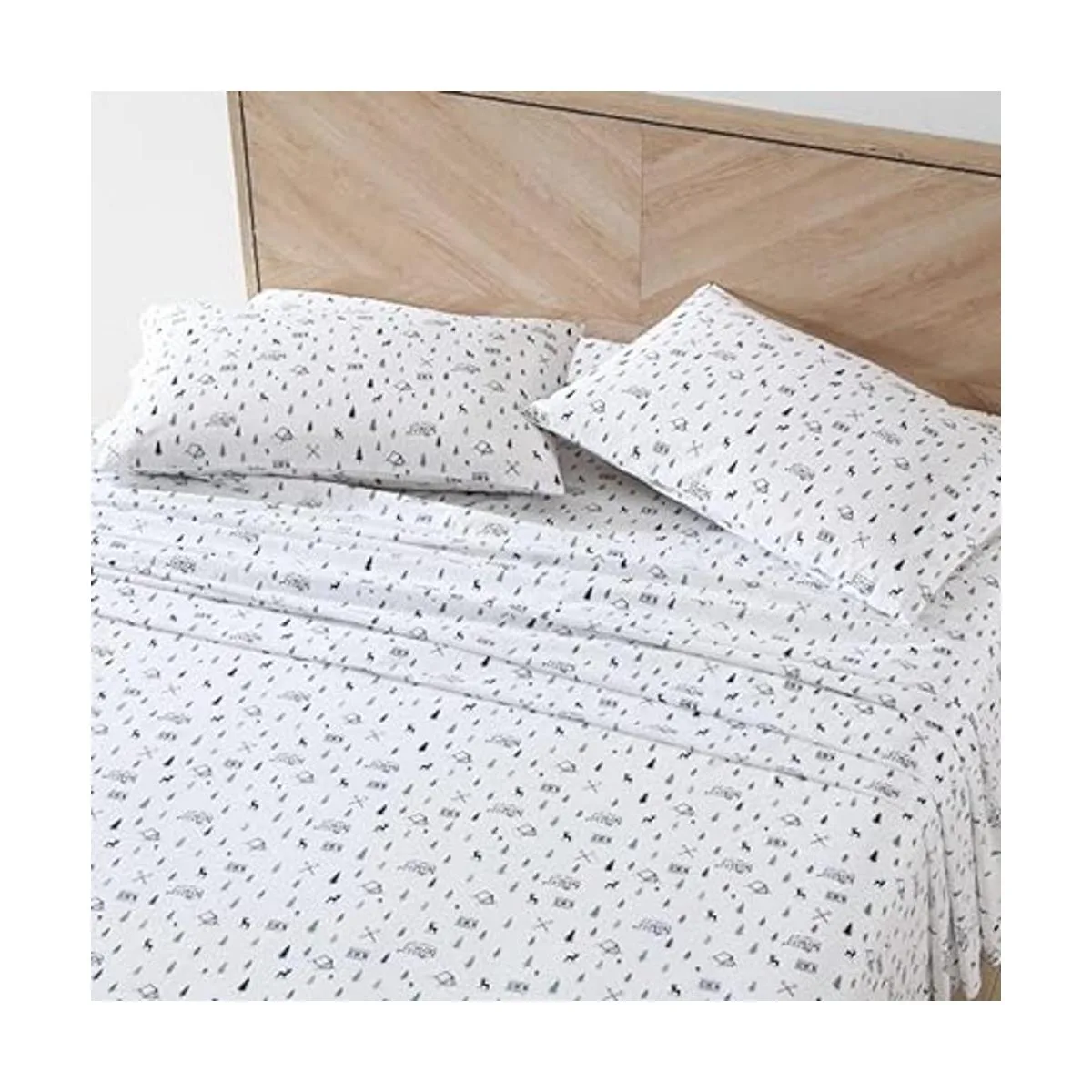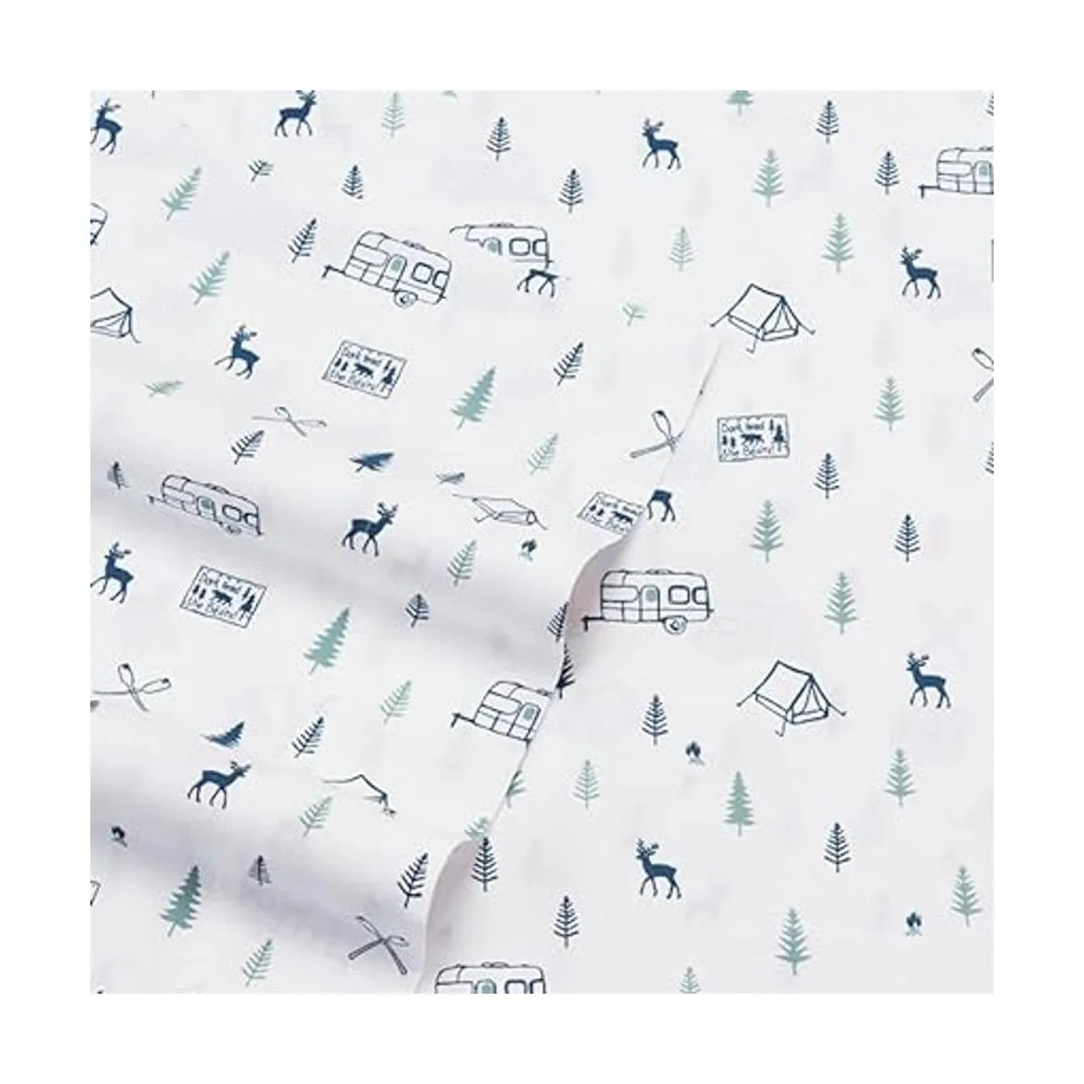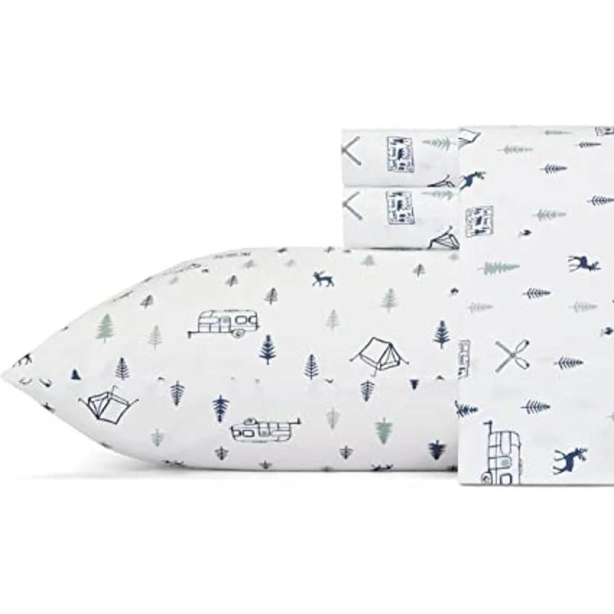 Estilo y textura: Sábana de una sola capa: perfecta para pieles sensibles; más transpirable y resistirá repetir lavados; tejido apretado para una mano súper suave; tejido para ser ligera. Este juego de sábanas de Eddie Bauer Campout cuenta con un diseño impreso de remolques, tiendas de campaña, pinos y ciervos sobre un fondo blanco