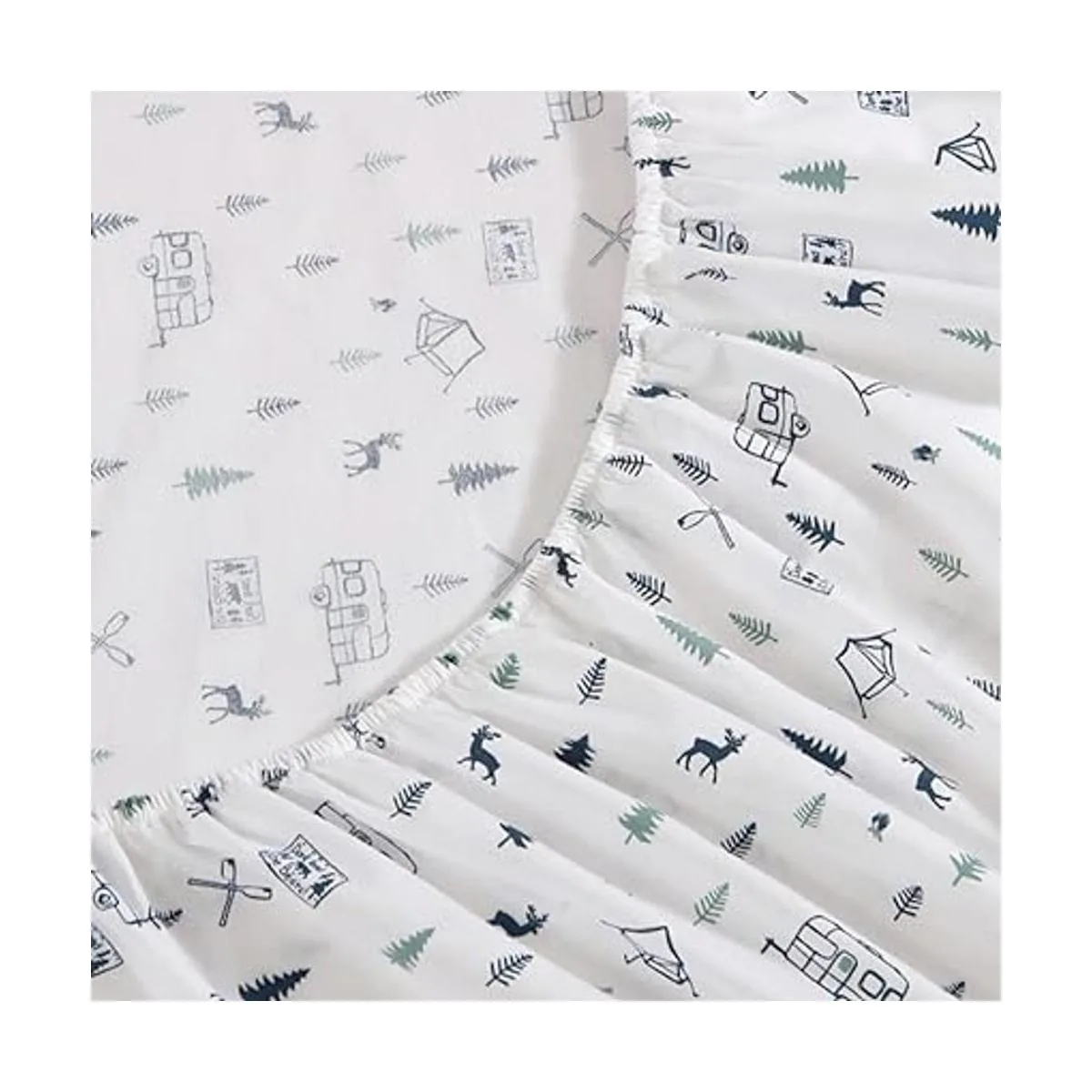 Bolsillo profundo y ajuste seguro: El juego incluye una sábana bajera totalmente elástica, con elástico de primera calidad en todo el contorno para mantenerla en su lugar. Bolsillo profundo: Sábana bajera de 15 pulgadas de profundidad 12 pulgadas para tamaños individuales. La sábana bajera se adapta a colchones de hasta 18 pulgadas de alto hasta 15 pulgadas para tamaños individuales; funda de almohada. Este juego de sábanas de Eddie Bauer Campout cuenta con un diseño impreso de remolques, tiendas de campaña, pinos y ciervos sobre un fondo blanco