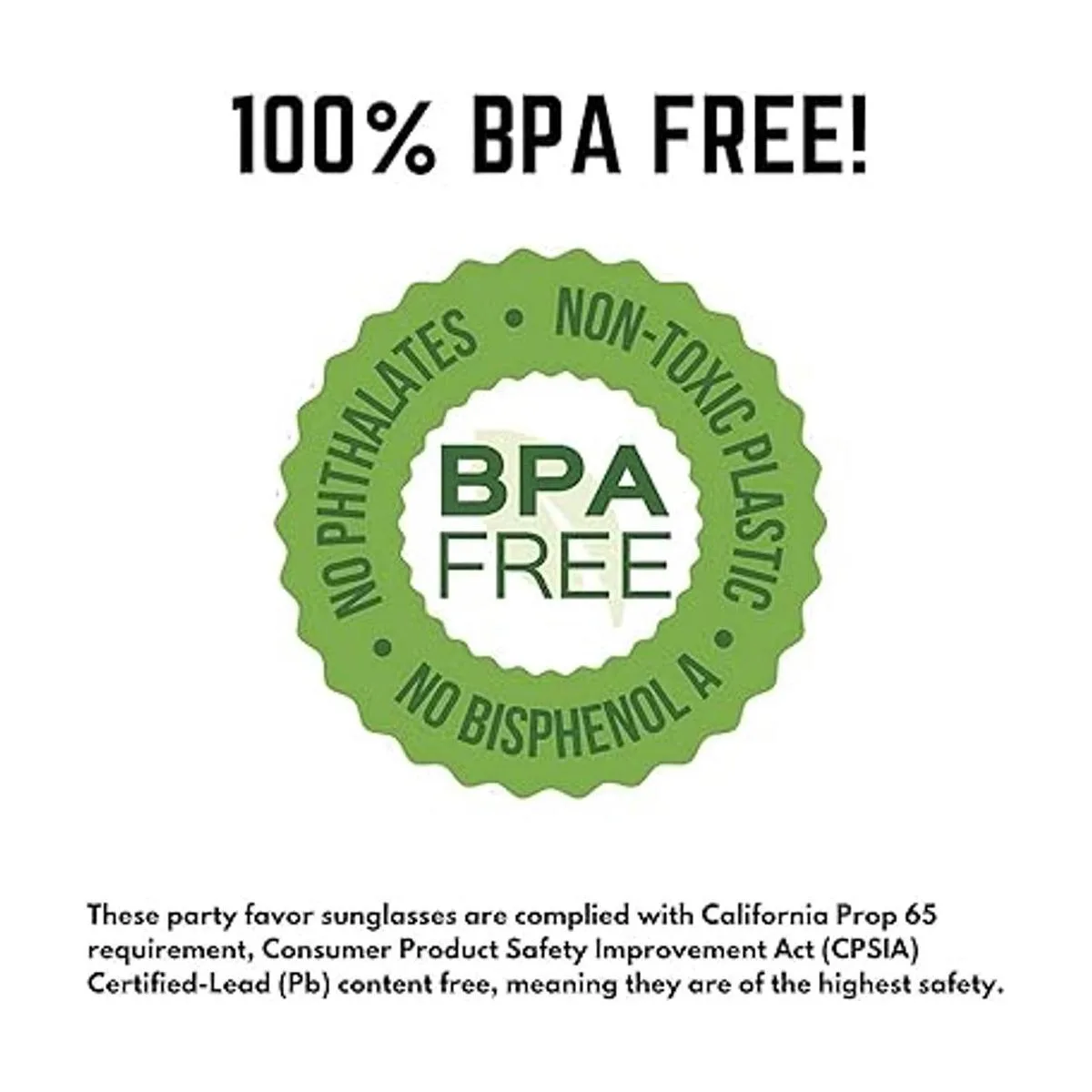 Certificado por la Ley de mejora de la seguridad de los productos de consumo CPSIA sin contenido de plomo PB, lo que significa que son de la más alta seguridad. Lentes resistentes a los impactos y transmisión de luz. Sin bisfenol A, sin ftalatos, plástico no tóxico, 100 libre de BPA.