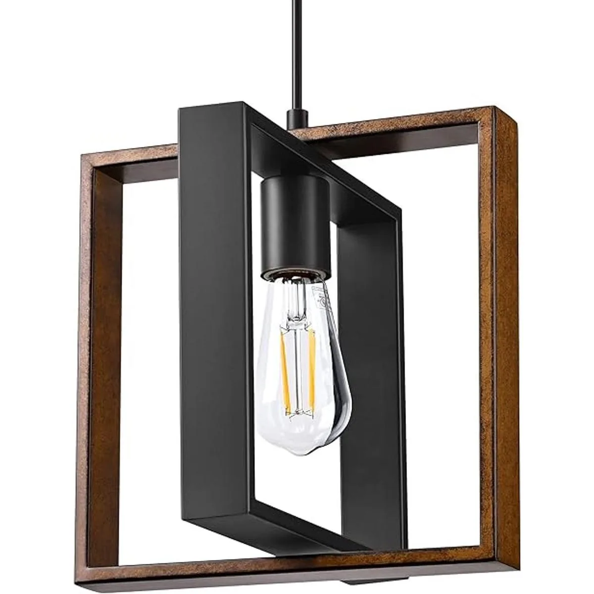 Diseño moderno y de granja: combina grano de madera con metal negro en una presentación cuadrada, los dos marcos se pueden girar completamente perpendicular o uno está dentro del otro de acuerdo a las necesidades, esta lámpara colgante simple pero artística añade un encanto de granja, vintage, rústico y elegante a tu hogar