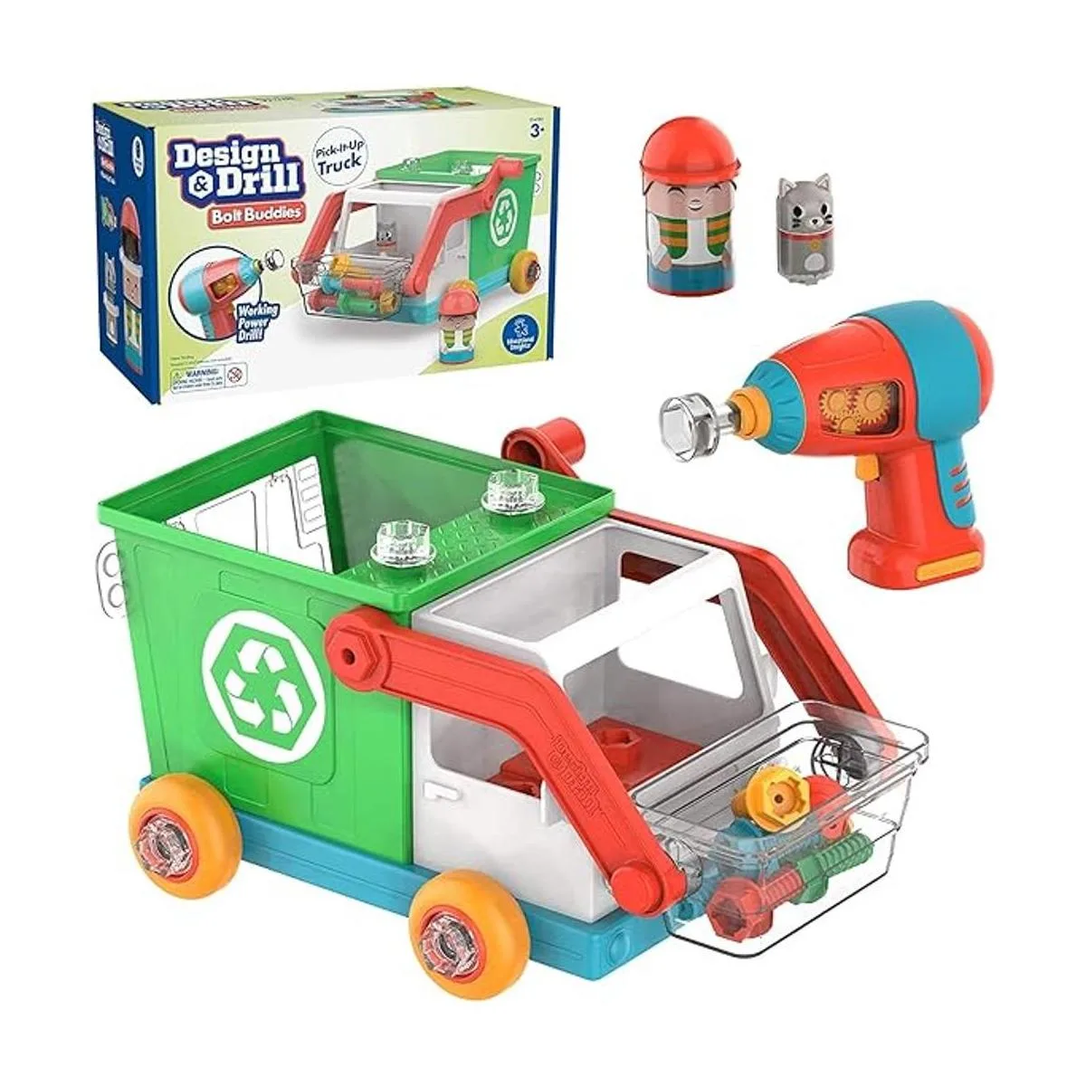 Educational Insights Design Drill Bolt Buddies Juguete de camión de reciclaje, juguete para quitar con juguete de taladro eléctrico, juguete STEM, regalo para niños y niñas, a partir de 3 años