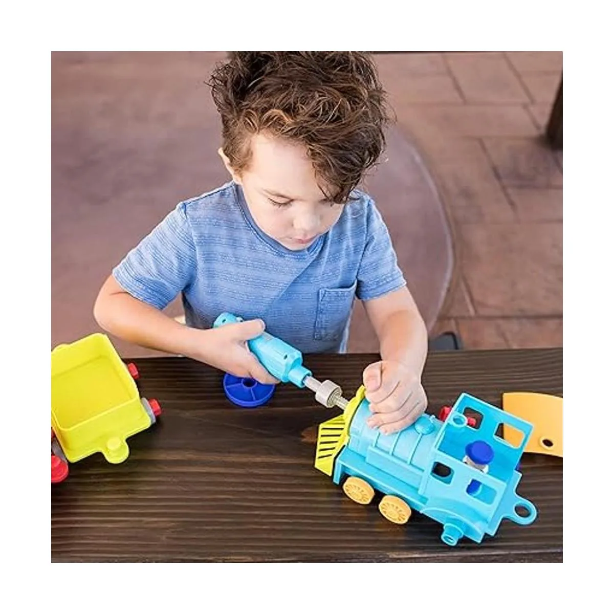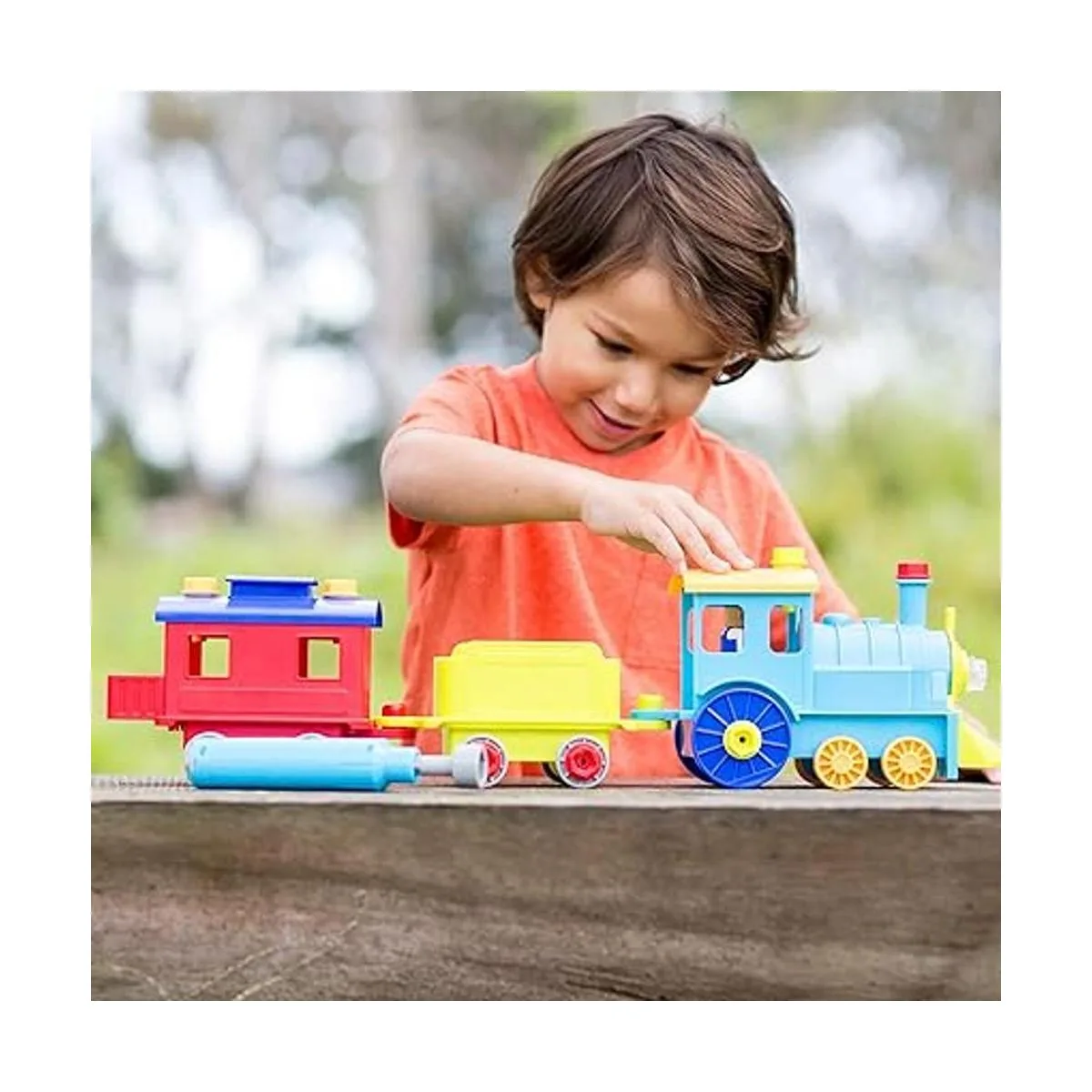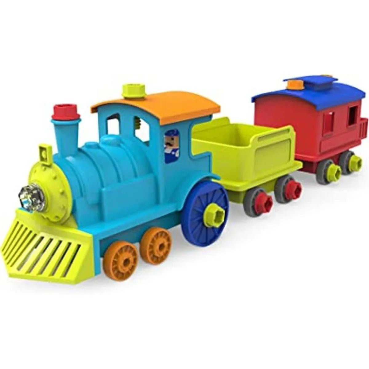 Fomenta la expresión artística: diseño y taladro. Todo el tren a bordo incluye juguete desmontable con 25 pernos, coche de motor de tren, coche de transporte, caboose, figura de conductor y taladro eléctrico de juguete para horas de construcción y diversión de construcción. Funciona con 5 pilas AAA no incluidas