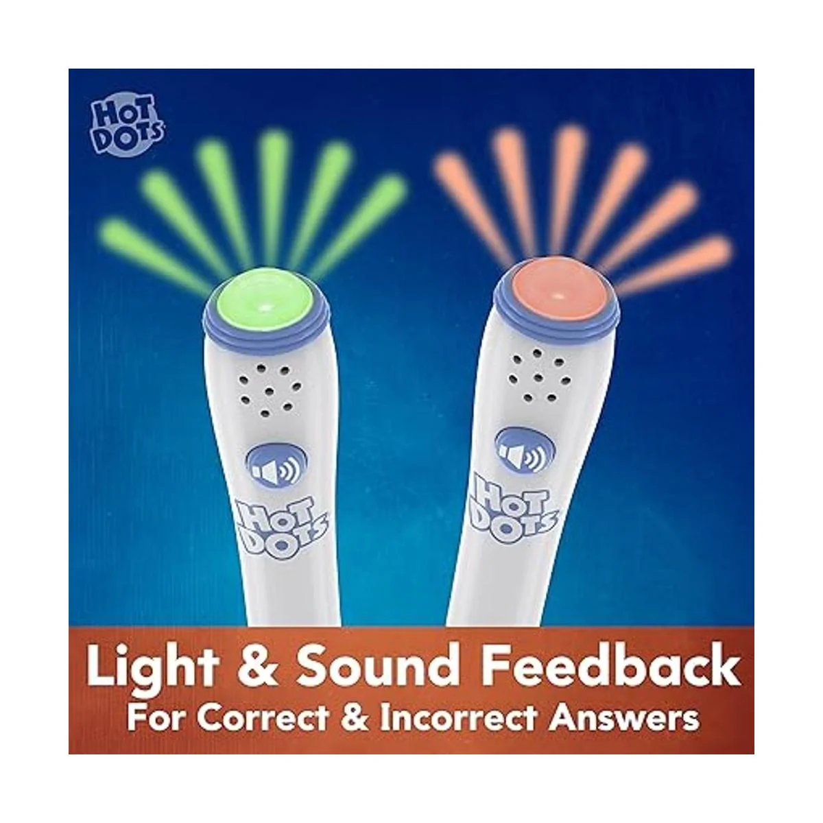 Comentarios instantáneos: el bolígrafo proporciona efectos de sonido de audio para respuestas correctas e incorrectas. El bolígrafo Hot Dots también se ilumina verde para respuestas correctas y se ilumina rojo para respuestas incorrectas. Los sonidos se pueden silenciar. El bolígrafo requiere 2 pilas AAA. Pilas no incluidas