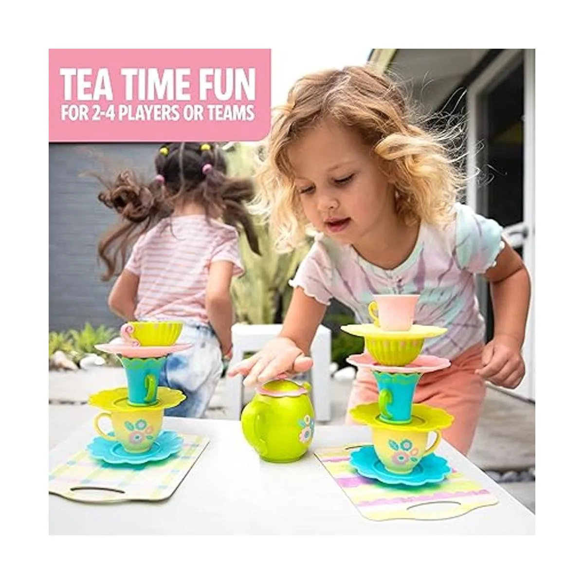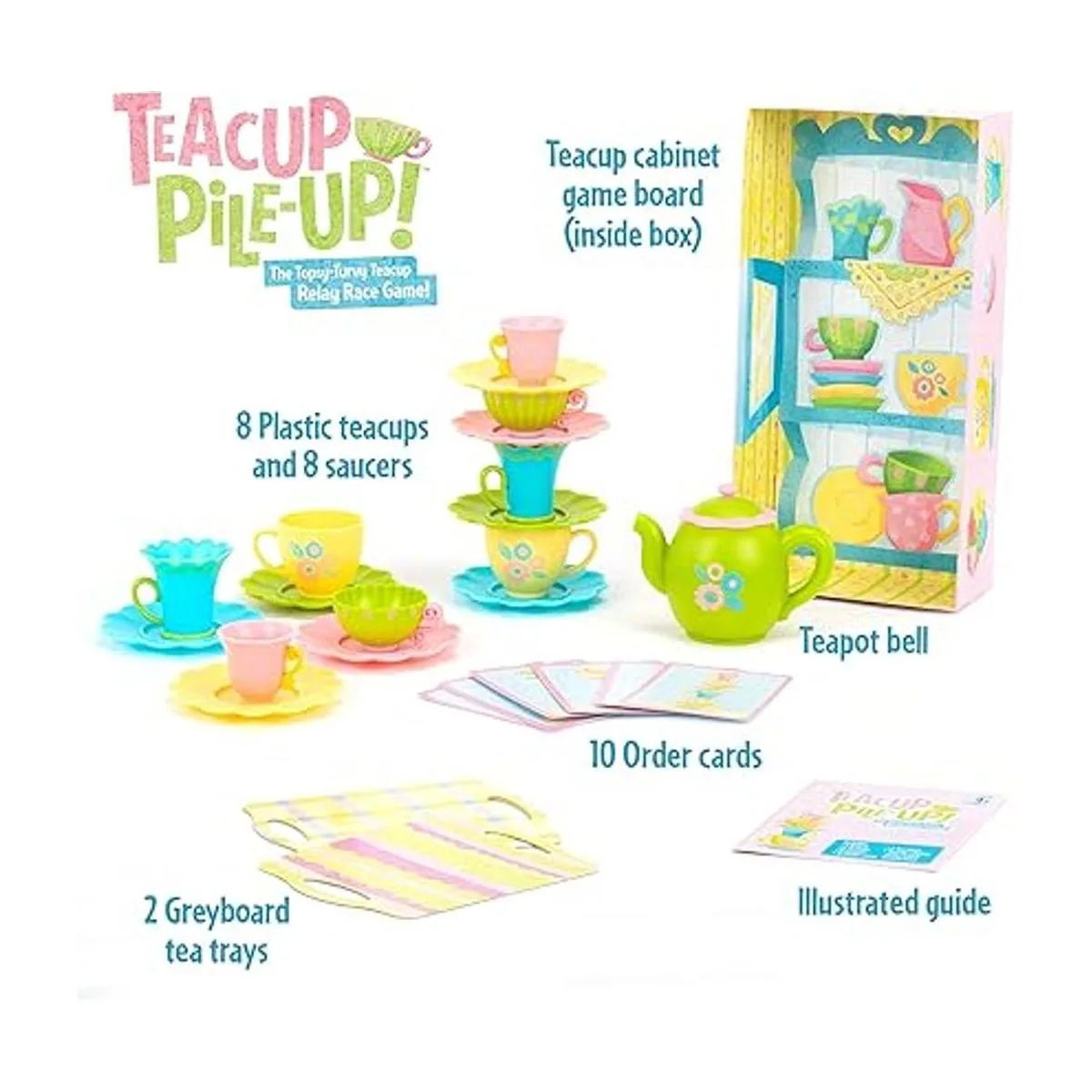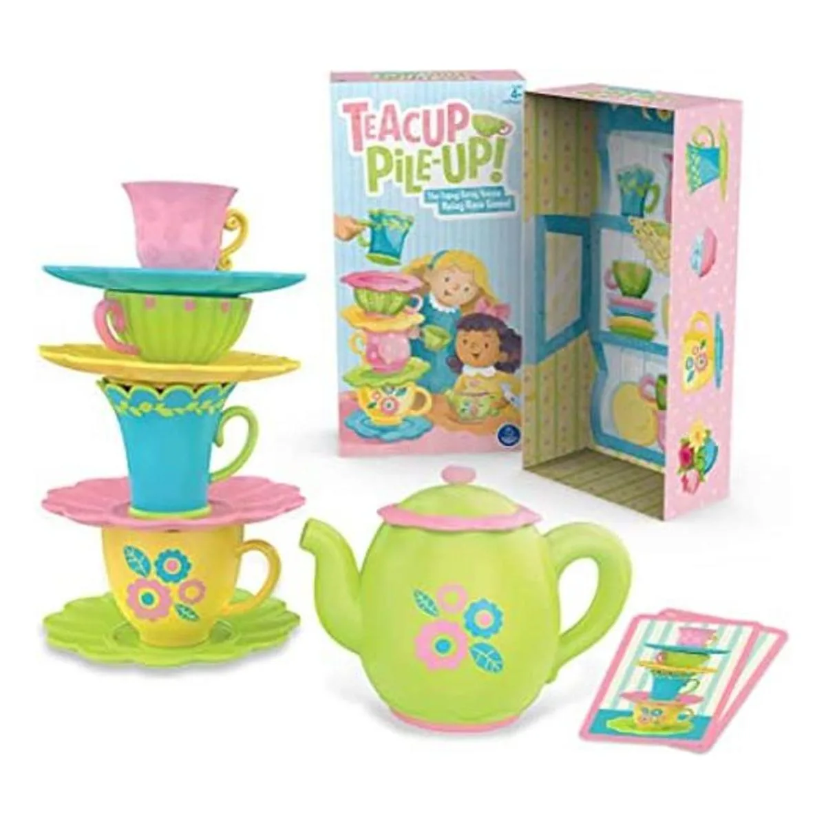 Cómo jugar: gira una tarjeta de desafío y encuentra la primera taza de té que se muestra. Corre para colocarlo en tu platillo y continuar, estilo relé, hasta que tu torre coincida con la pila de la tarjeta. Completa correctamente la torre y suena la campana de la tetera primero y ganas el juego