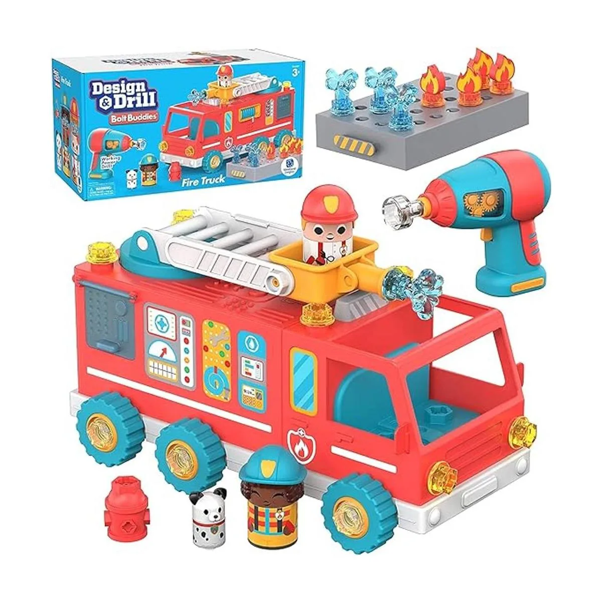 Juego de construcción de perforación: los niños utilizan un taladro de juguete real, funcional y seguro para los niños para construir su propio camión de bomberos, completo con escalera con bisagras y cubiertas de fuego y agua, luego coloca el bombero Bolt Buddy, el jefe de bomberos y el amigo de perro dálmata en el camión y corre en la diversión de juego de simulación Gran manera de introducir habilidades STEM tempranas