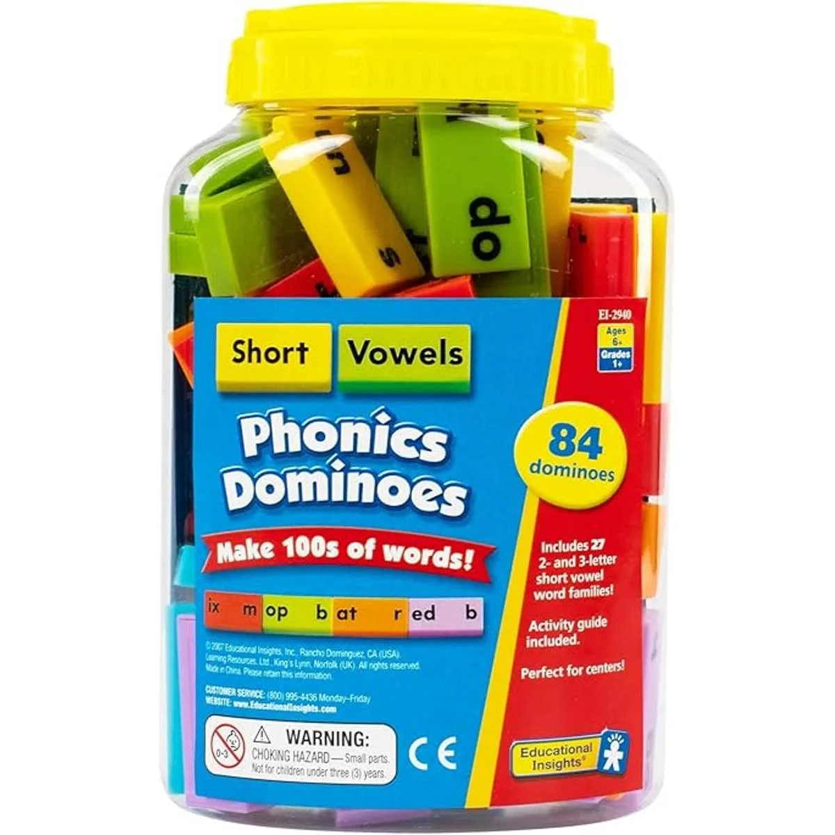 Educational Insights Phonics Dominóes Vocales cortas Manipulativo para aula y hogar, juego de 84 dominó en 6 colores, a partir de 6 años