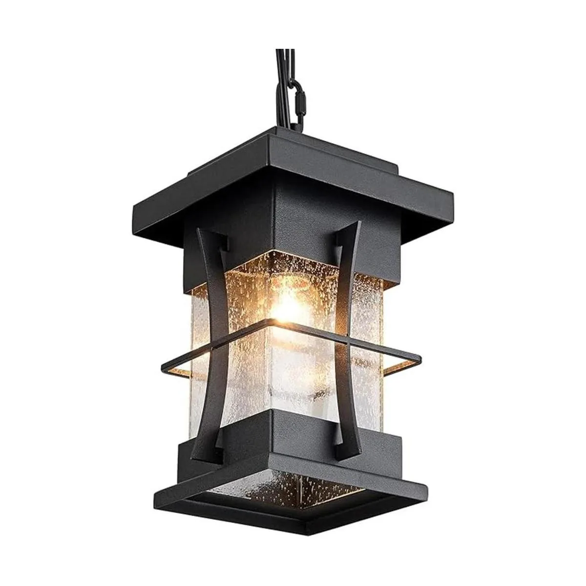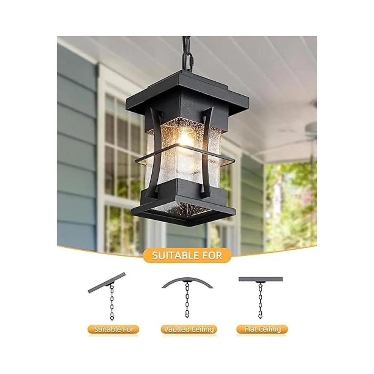 EERU Lámpara colgante exterior con cadena ajustable con acabado negro con cristal semillado exterior luces para casa patio frontal porche iluminación