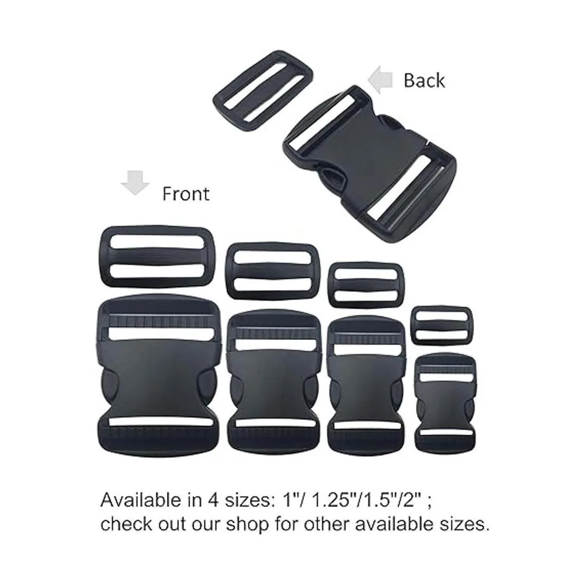 Tamaño: juego de 6 hebillas de liberación lateral plana de 2.0 in y deslizamientos de tres deslizamientos, se ajusta a correas de cincha de 1.969 in. Disponible en 4 tamaños: 1.0 in, 1.2 in, 1.5 in, 2.0 in.