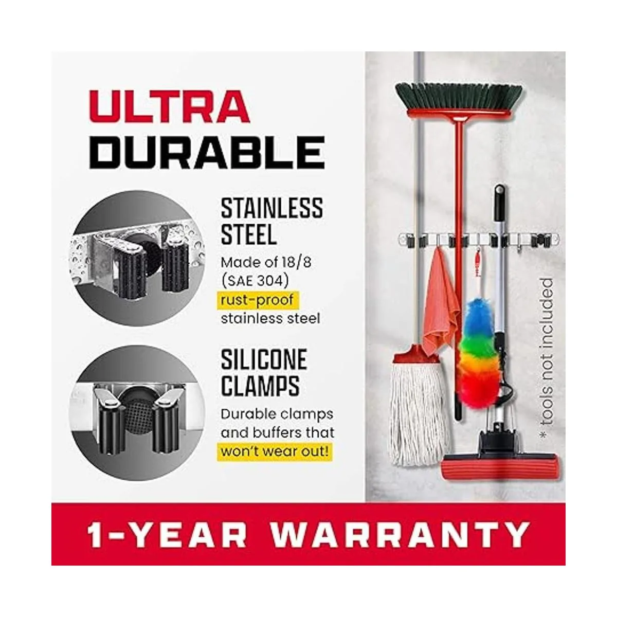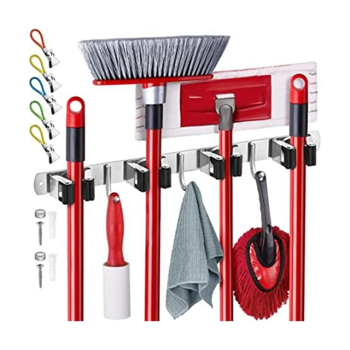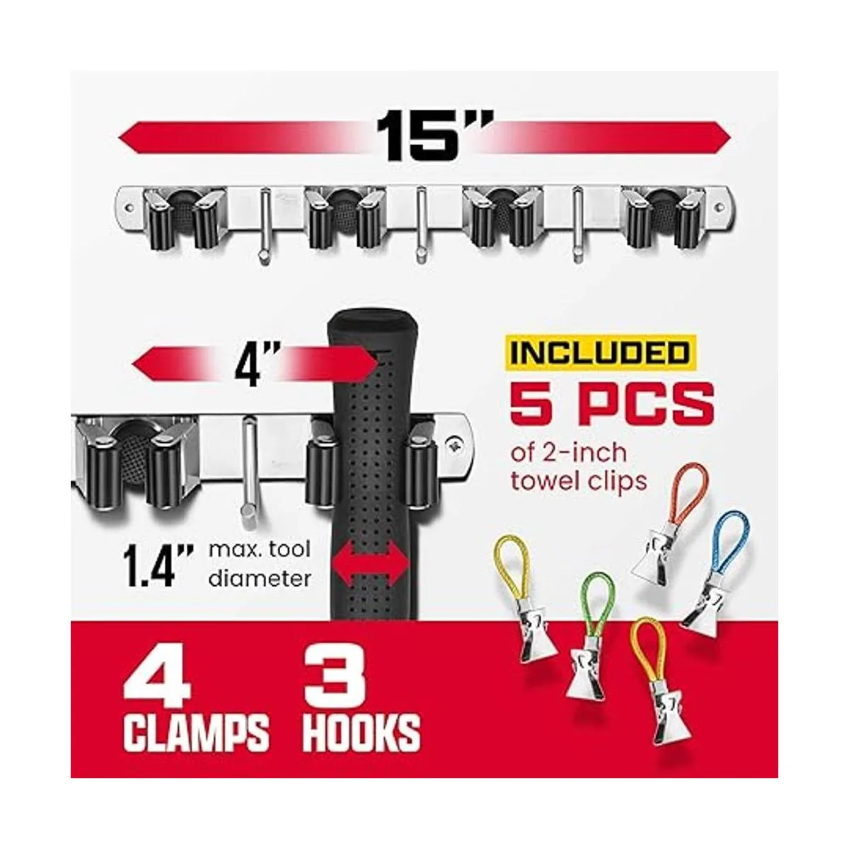 Effektivtools Soporte de pared para trapeador y escoba Organizador autoadhesivo de acero inoxidable 4 abrazaderas, 3 ganchos, 5 clips para colgar toallas Soporta hasta 40 libras
