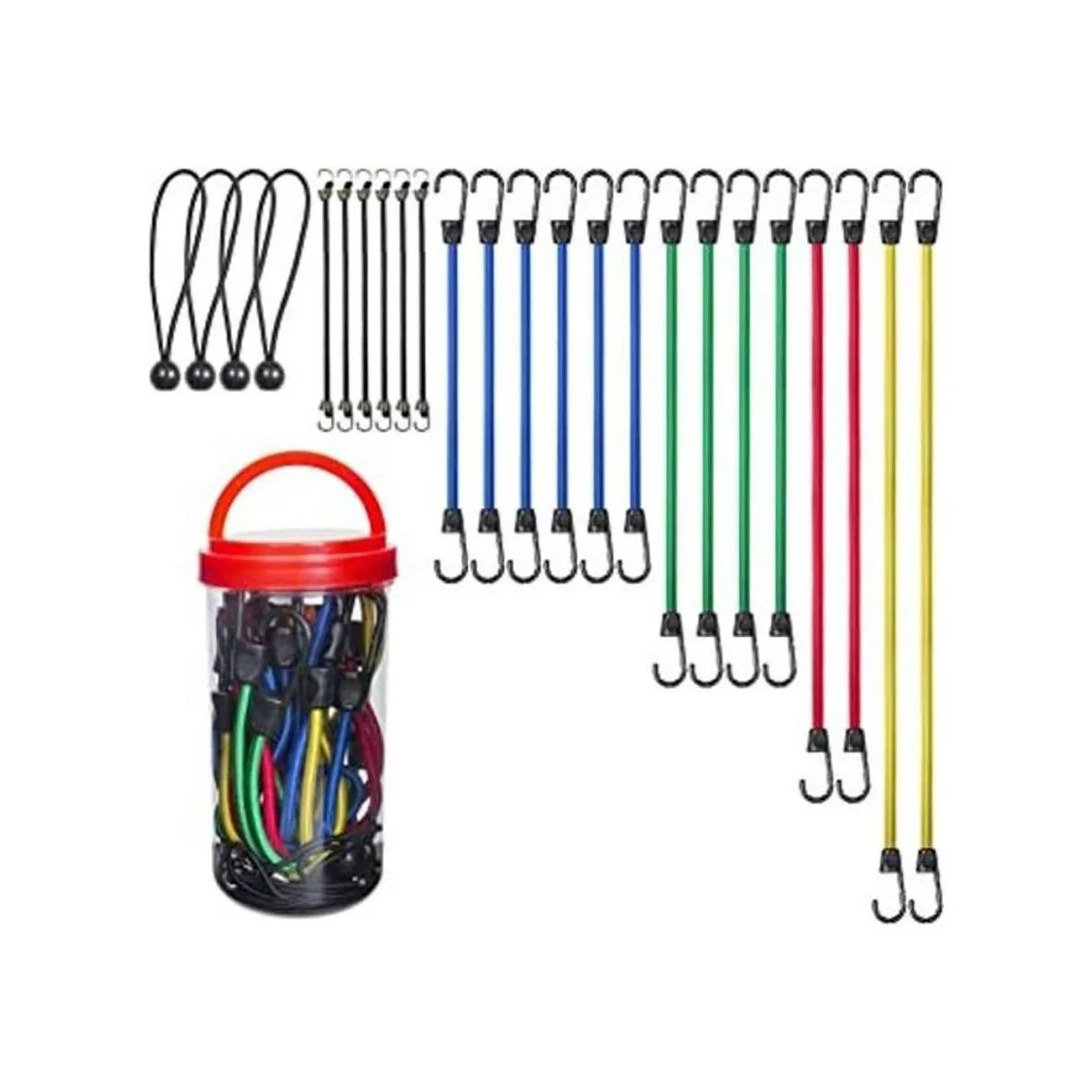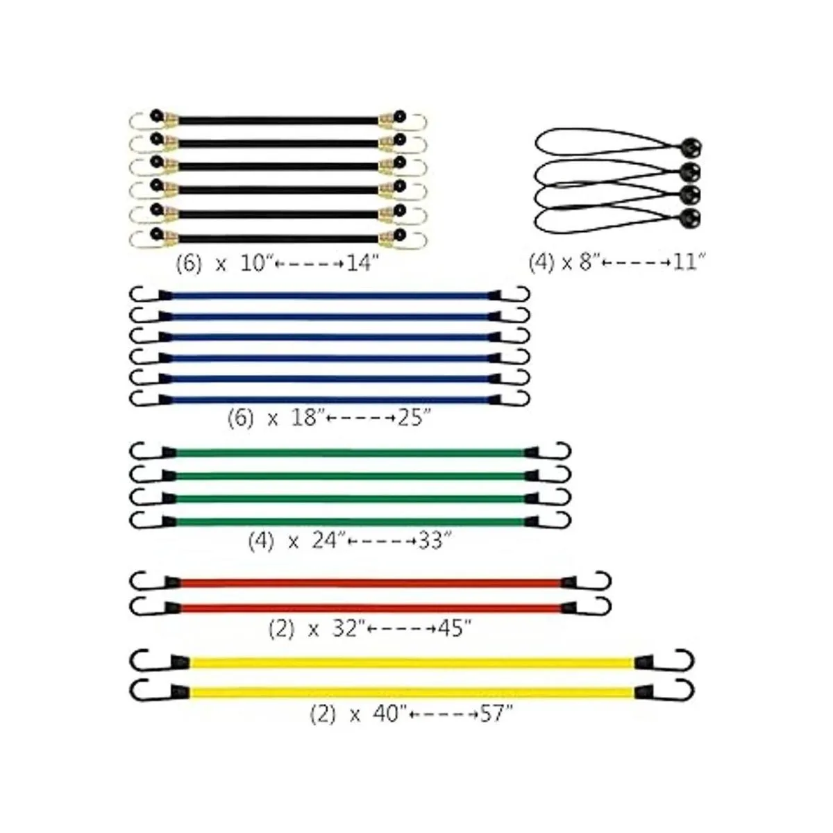 Incluye varios tamaños y tipos 6 piezas. x 18 pulgadas, 4 unidades. x 24 pulgadas, 2 pc. x 32 pulgadas, 2 unidades. x 40 pulgadas cuerdas elásticas; 6 piezas x mini cables de 10.0 in; 4 unidades. x 8 pulgadas bola de cuerdas elásticas