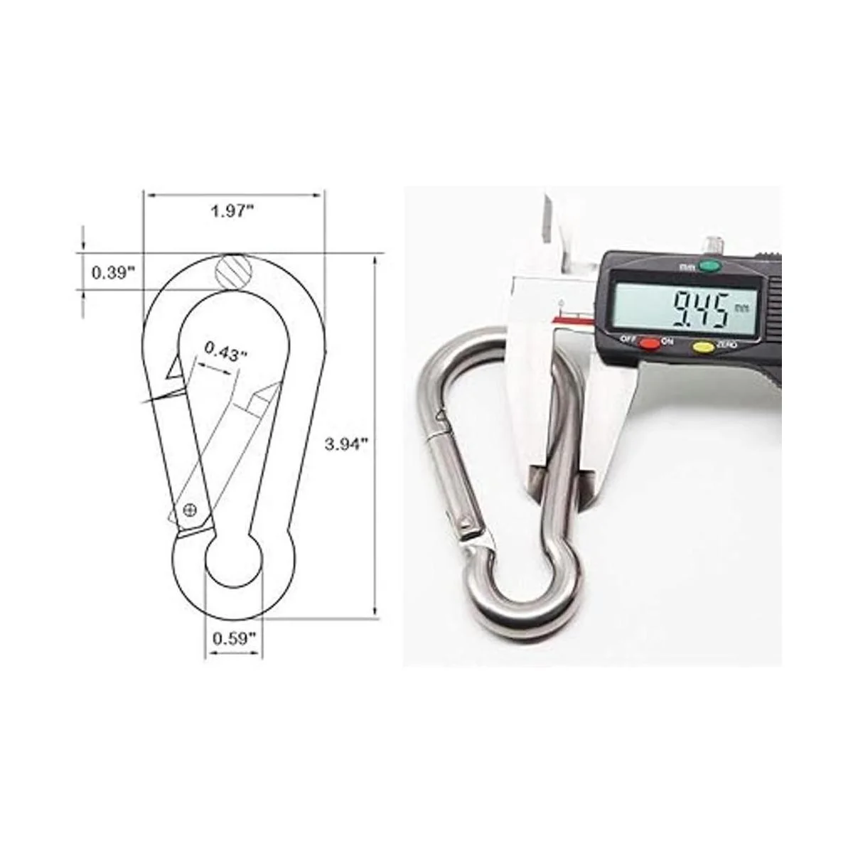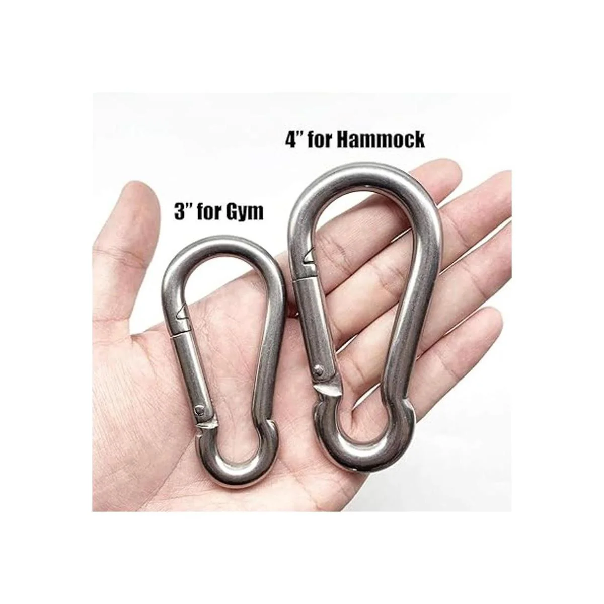 Contenido del paquete: recibirás 2 paquetes de mosquetones de resorte de alta resistencia, la longitud de 3.937 in, y el ancho de 1.969 in, lo suficientemente grande para cualquier hamaca o columpio.