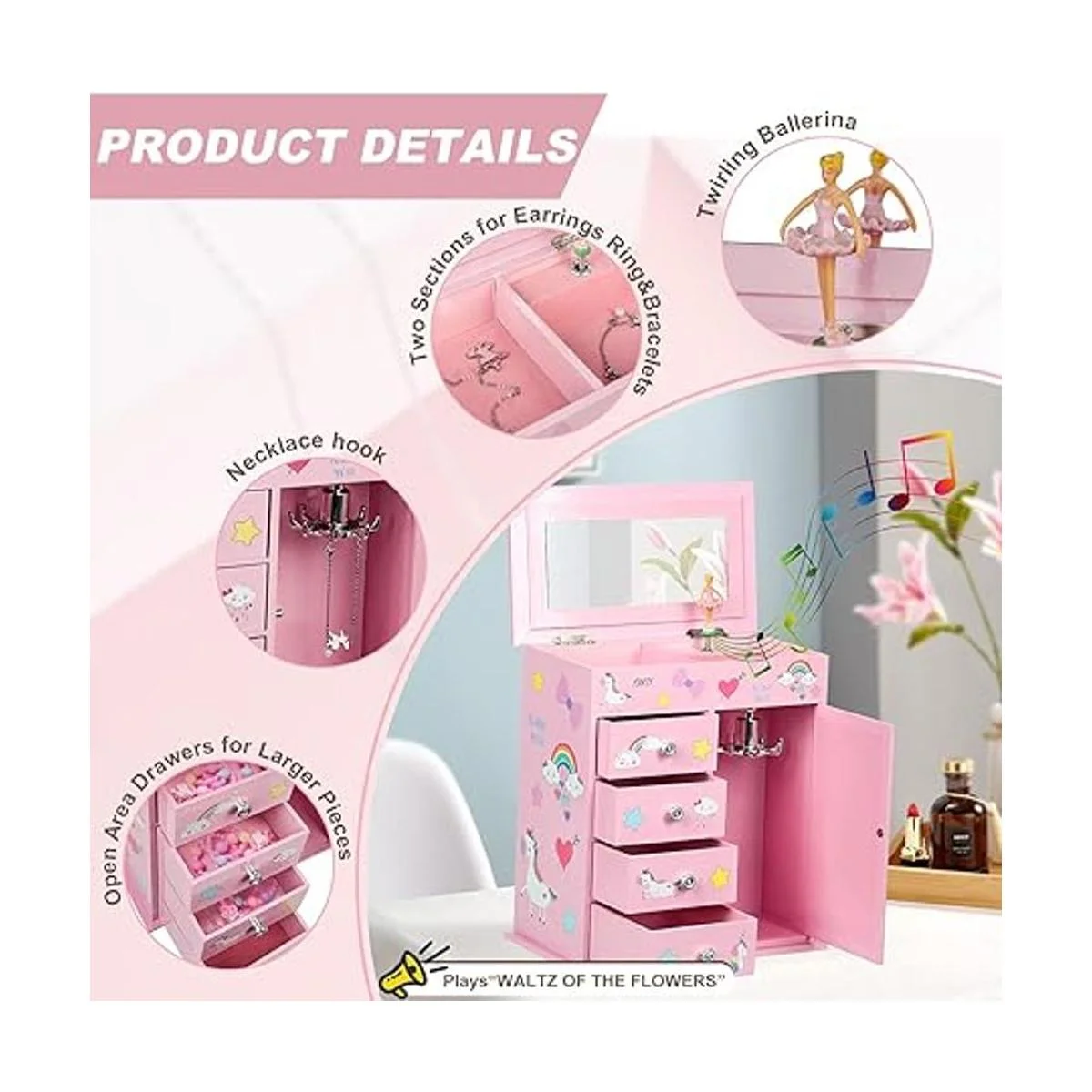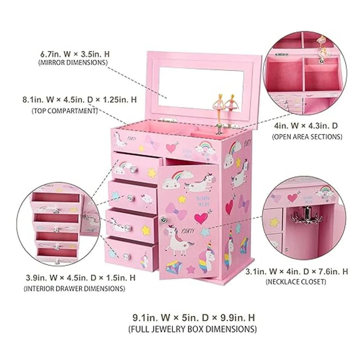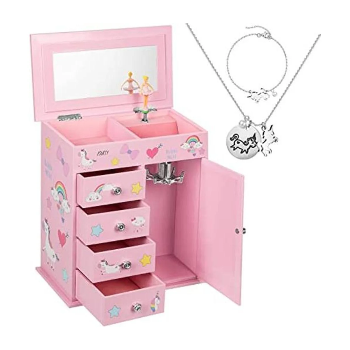 Decoración del hogar y ahorro de espacio: con nuestro joyero todas tus joyas estarán perfectamente organizadas y fáciles de alcanzar. Ya no hay tocador desordenado. El exquisito aspecto rosa y el patrón de unicornio, así como la hermosa música, decora tu hogar. Para niños de 3 a 18 años.