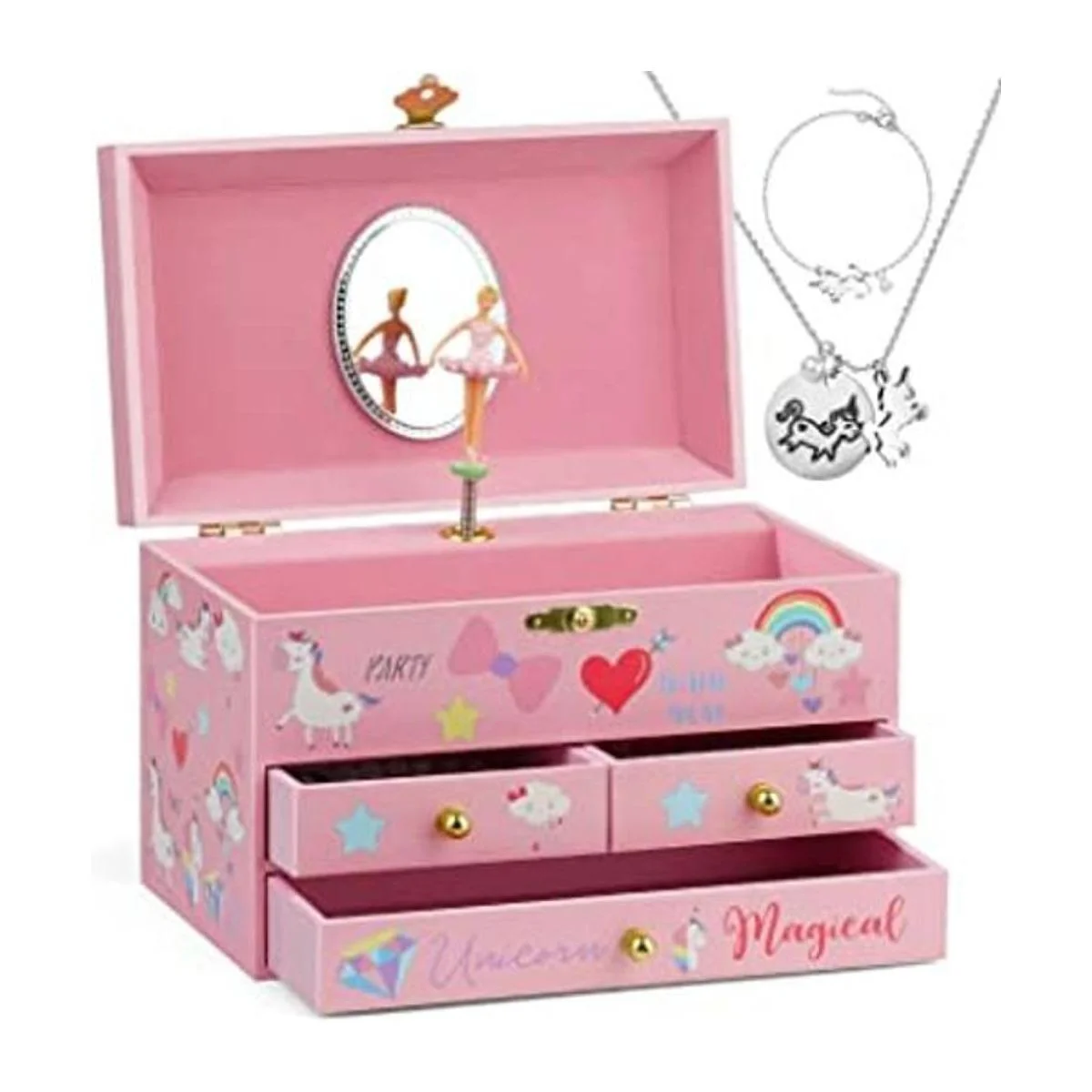 Regalo ideal: la hermosa caja de música de unicornio es el regalo perfecto para niñas Tu niña recibe esta exclusiva caja de música, completa con cajón extraíble, espejo grande y bailarina giratoria. En la caja, te sorprenderá descubrir que hay hermosos collares y pulseras de unicornio, empaquetados en exquisitas bolsas de regalo. Los collares y pulseras son adecuados para todas las edades, por lo que si quieres comprar joyas de unicornio como regalo de cumpleaños de una niña, esta es la elección perfecta.