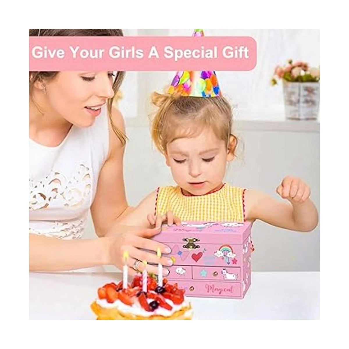 Gran capacidad de espacio: tamaño: 7.5 x 4.8 x 4.5 pulgadas. Nuestro joyero de música de unicornio puede organizar fácilmente las joyas de las niñas. Dos cajones pequeños y un cajón grande proporcionan un montón de espacio de almacenamiento para collares, pulseras, pendientes y otros recuerdos. No solo ayuda a mantener una habitación desordenada en orden, sino que también puede decorar la habitación.