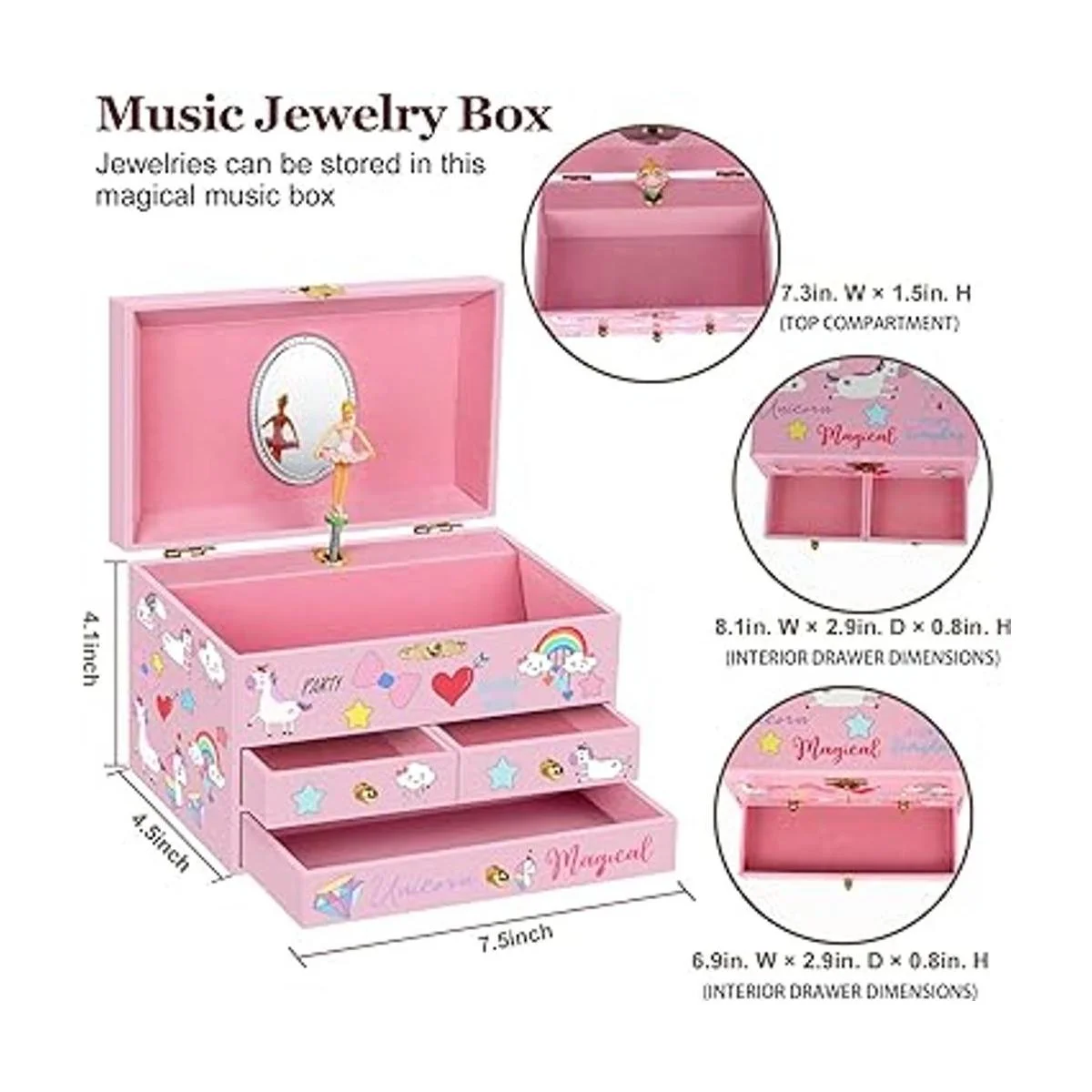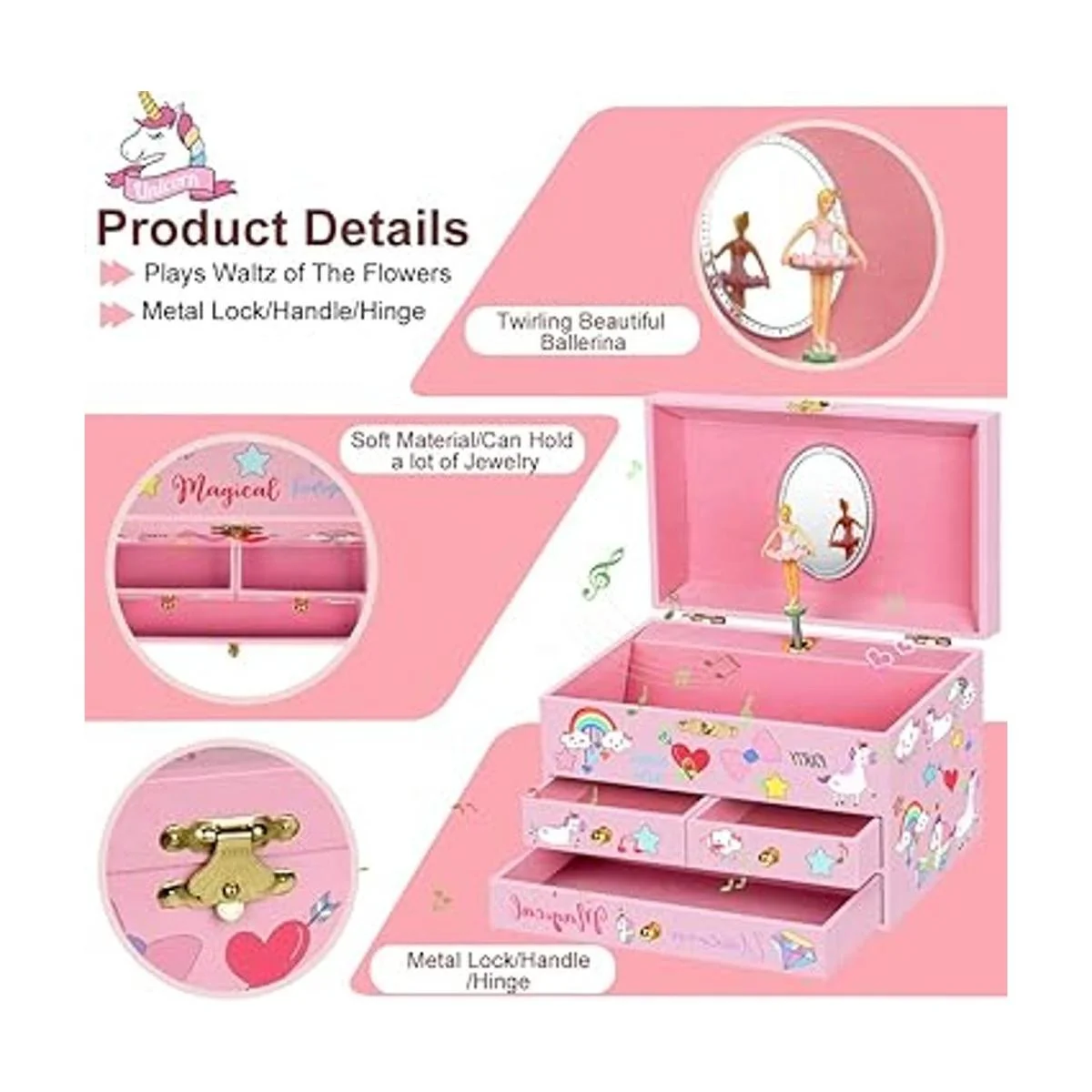 efubaby Joyero musical para niñas con diseño de unicornio de bailarina giratoria, 3 cajones extraíbles, juego de joyas de unicornio incluido caja de joyería para niños para niñas pequeñas, regalo de cumpleaños, vals de flores