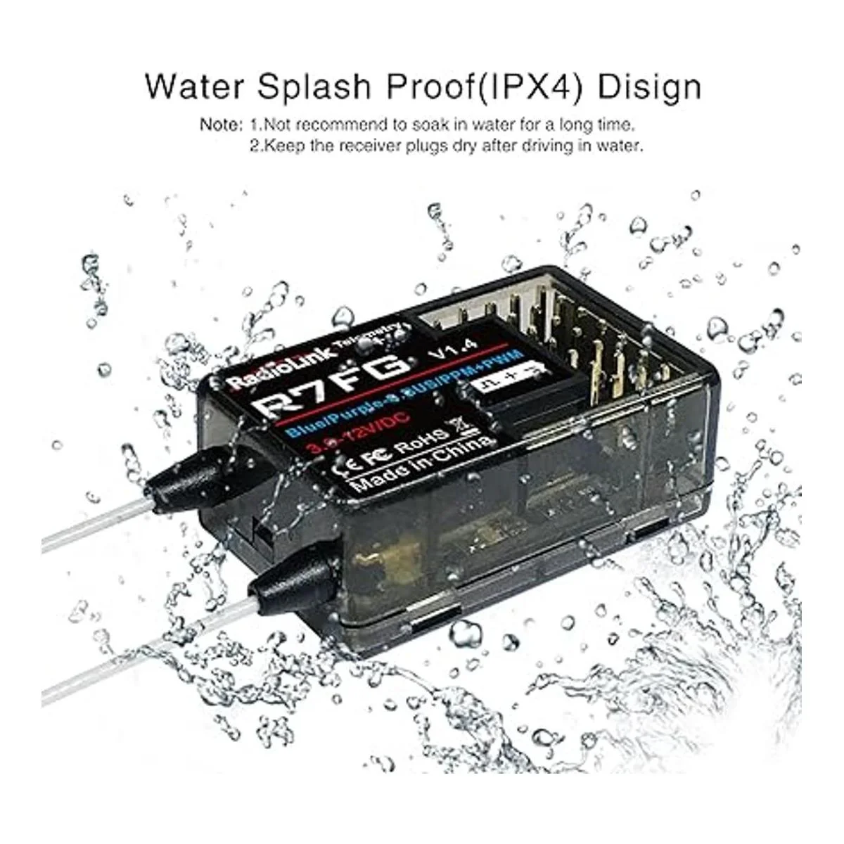 Características clave: con giroscopio en el interior, voltaje del modelo de telemetría, voltaje del receptor y RSI indicador de fuerza de señal recibida, a prueba de salpicaduras de agua IPX4, protección de polaridad antirreversa, rango de control de hasta 1,968.5 ft en el suelo, respuesta de baja latencia en los 7 canales.
