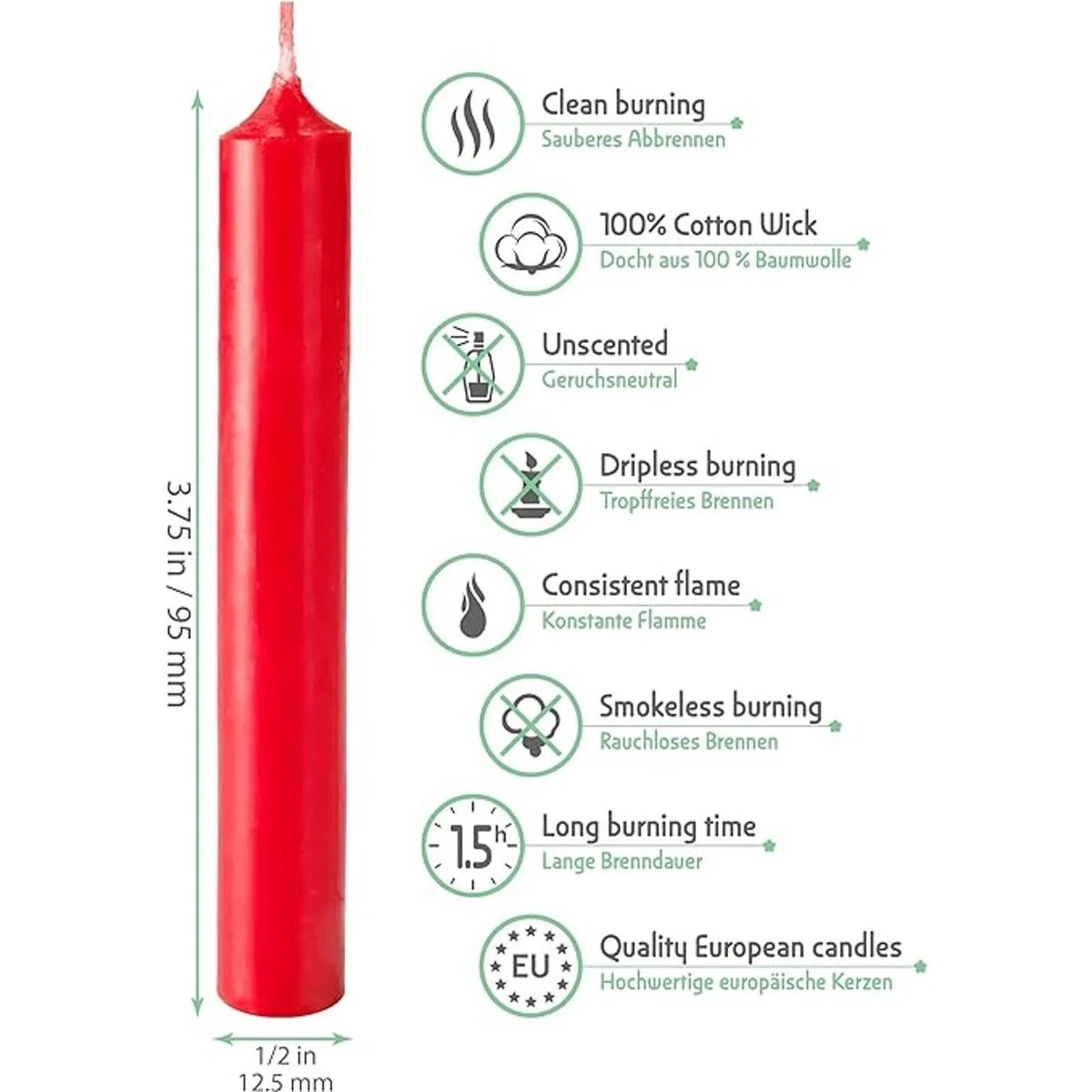 Calidad premium fabricada en Europa: la marca Eika es conocida por su calidad única de velas. Color sólido, estas velas se queman muy limpiamente, sin humo y sin olor. Tienen un largo tiempo de combustión de 1,5 horas