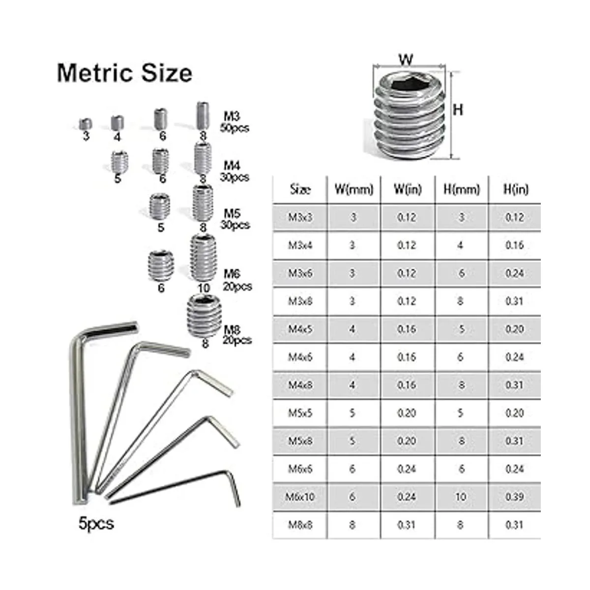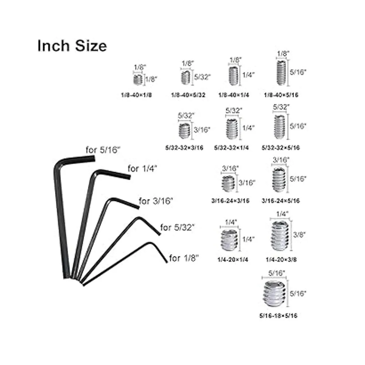 Tamaño universal: el surtido de tornillos incluye los tamaños más populares comunes. Métrico: M3 M4 M5 M6 M8. Estándar SAE: 1/8401/8, 1/8405/32, 1/8401/4, 1/8405/16, 5/32323/16, 5/32321/4, 5/32325/16, 3/162424. 3/16, 1/4245/16, 1/4201/4, 1/4203/8, 5/16185/16. Estas tripulaciones de puntos de copa de accionamiento hexagonal vienen con 5 llaves hexagonales.