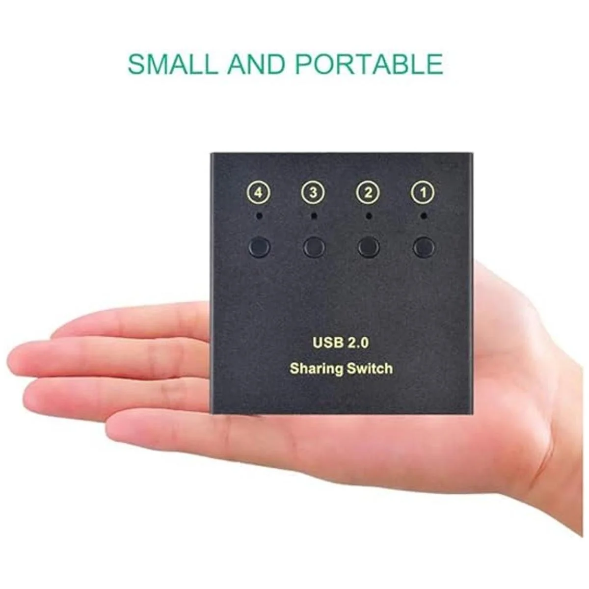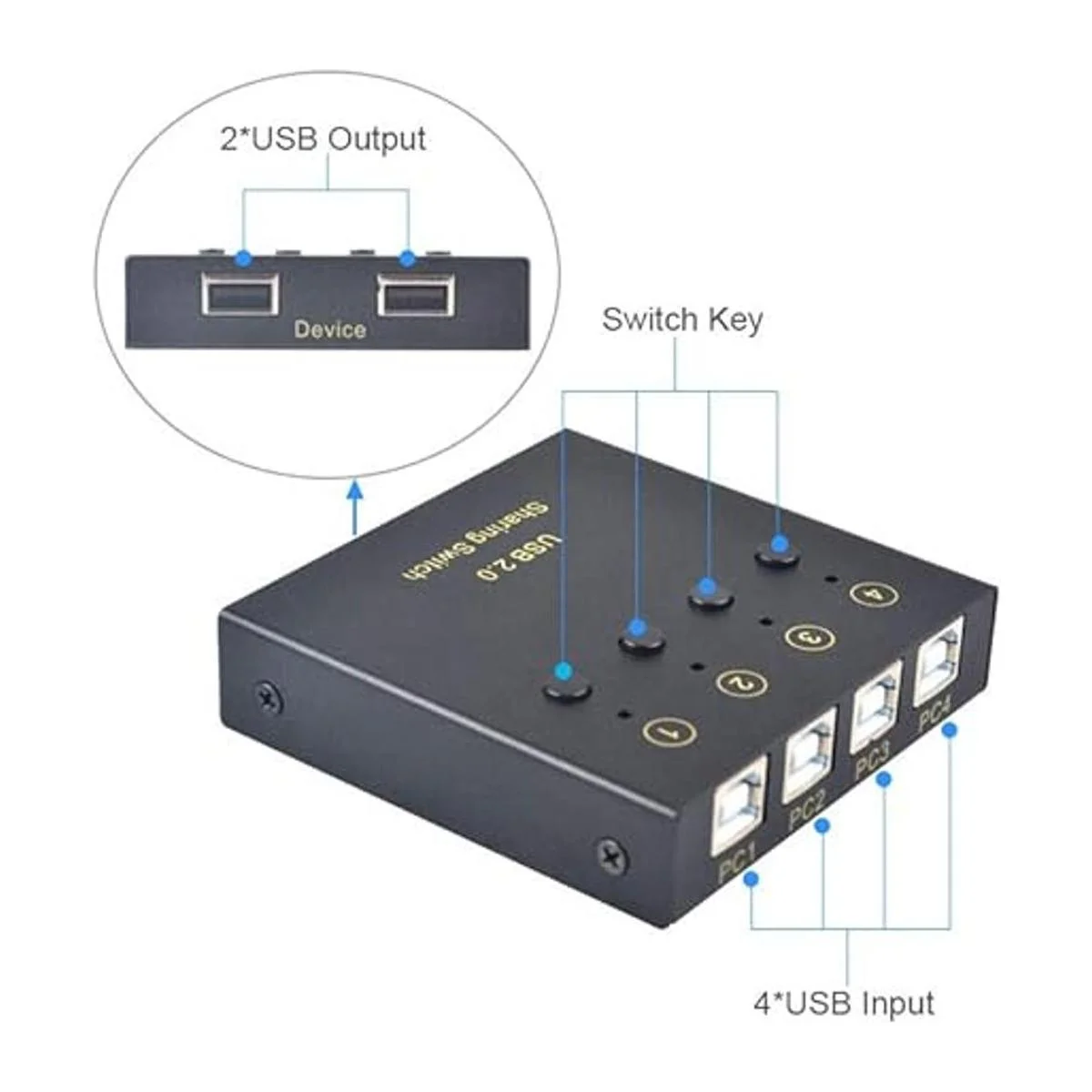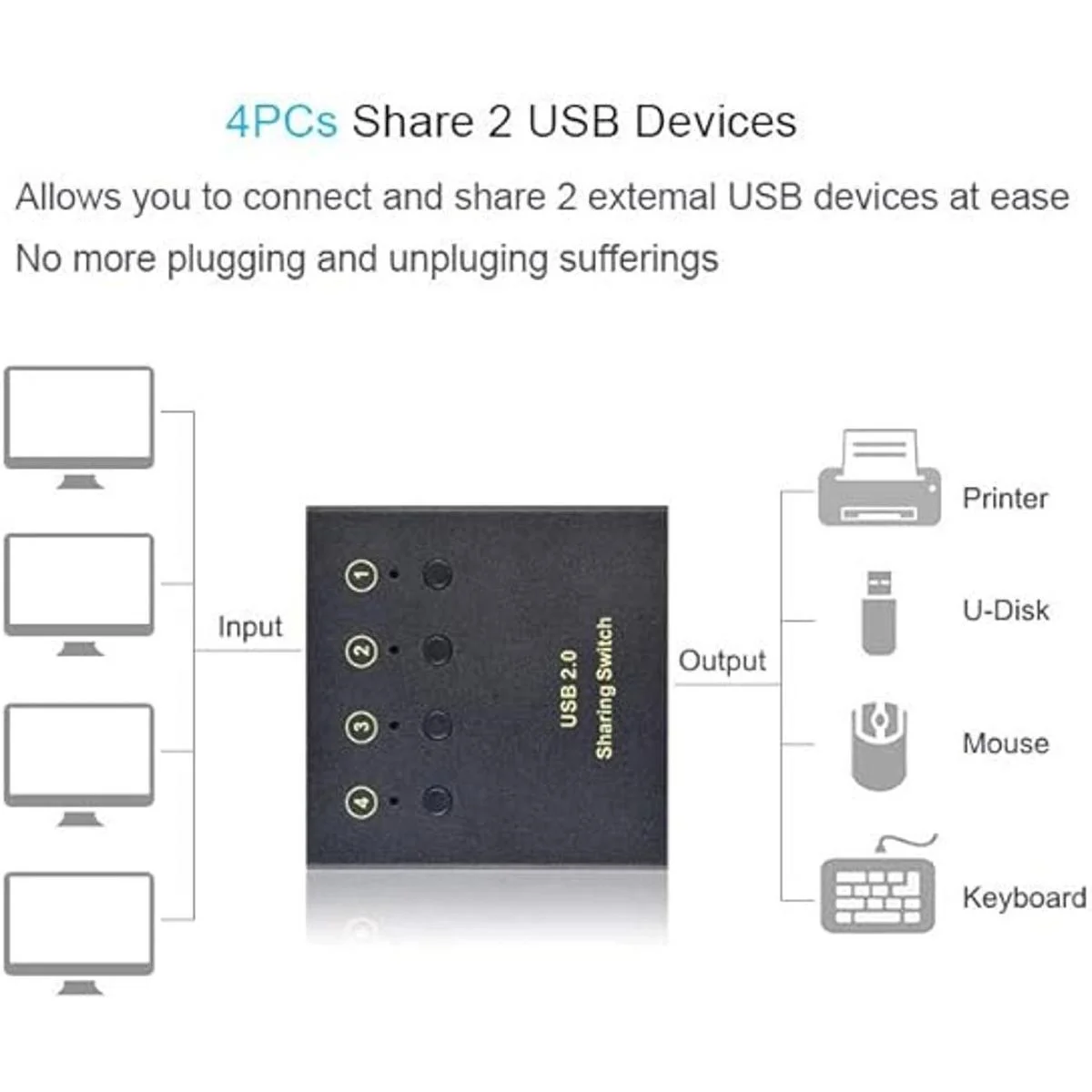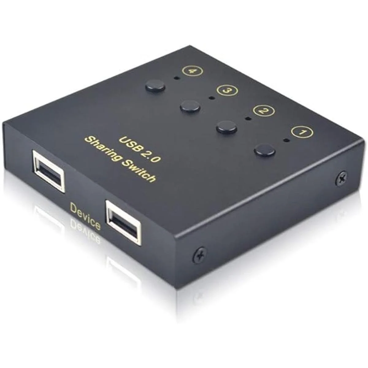 Este conmutador de 4 puertos USB permite cambiar entre 4 ordenadores para compartir 2 dispositivos periféricos USB 2.0 sin necesidad de cambiar constantemente los cables o configurar un complicado software de intercambio de red;