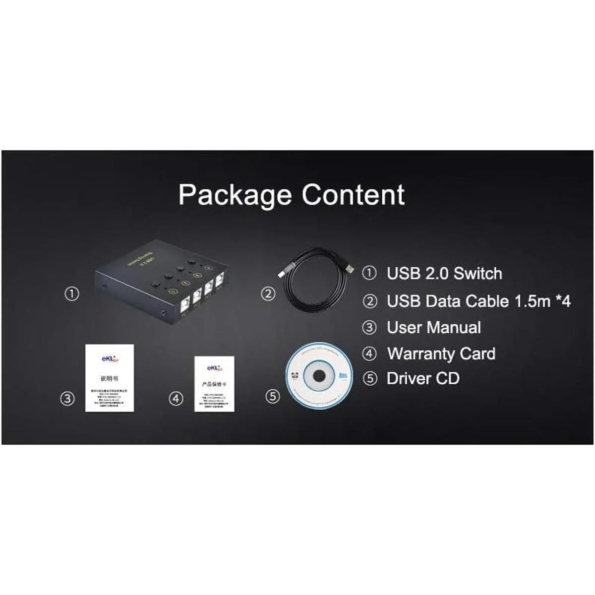 eKL Interruptor USB 4 computadoras, 2 dispositivos USB, USB 2.0, conmutador periférico, para ratón, teclado, PC, escáner de impresión, con botón de cambio y 4 cables USB A a B
