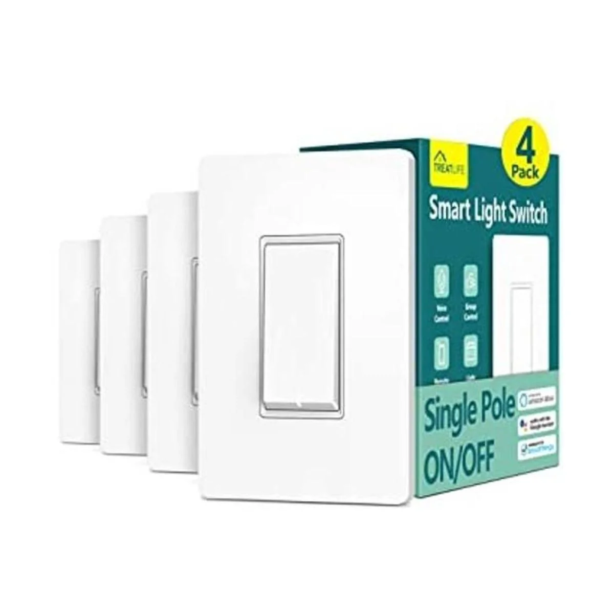 El interruptor inteligente Treatlife de un solo polo funciona con Alexa, Google Home y SmartThings, interruptor de luz de temporizador WiFi de 2.4 GHz, requiere cable neutro, no requiere concentrador, listado ETL, FCC, paquete de 4