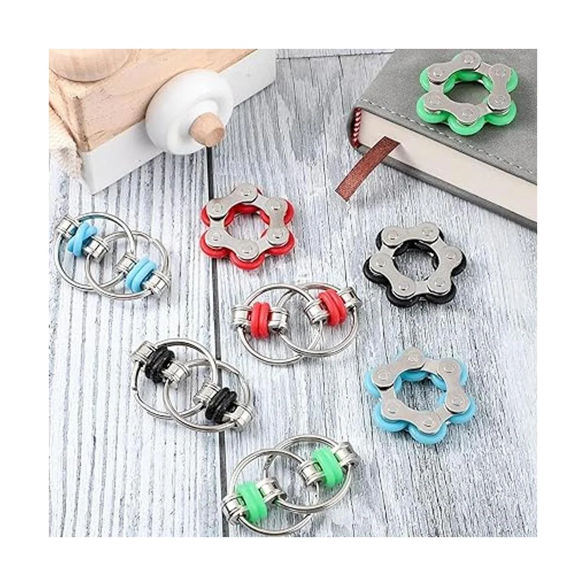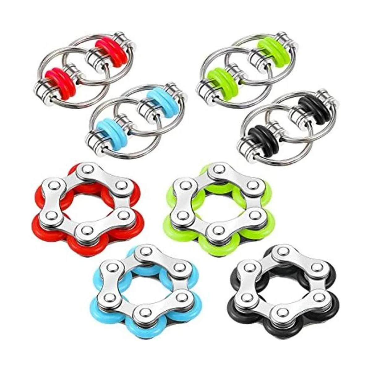 El juego de 8 juguetes para ansiedad incluye 4 cadenas de rodillo giratorio y 4 cadenas de seis ruedas para bicicleta, juego de juguetes adecuados para adultos y adolescentes en ayuda de aprendizaje rojo, azul cielo, verde, negro