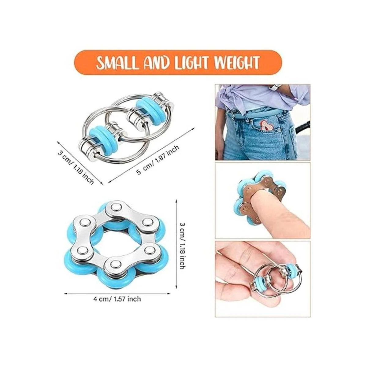 Dimensiones adecuadas: el tamaño del juguete de cadena de seis rodillos es de 1.6 x 1.4 in, y el tamaño de la cadena abatible es de aproximadamente 1.9 x 1.2 in, adecuado para usar en escuelas, trabajo, reuniones, iglesias, bibliotecas y otros lugares sin ruido y no molestará a los demás