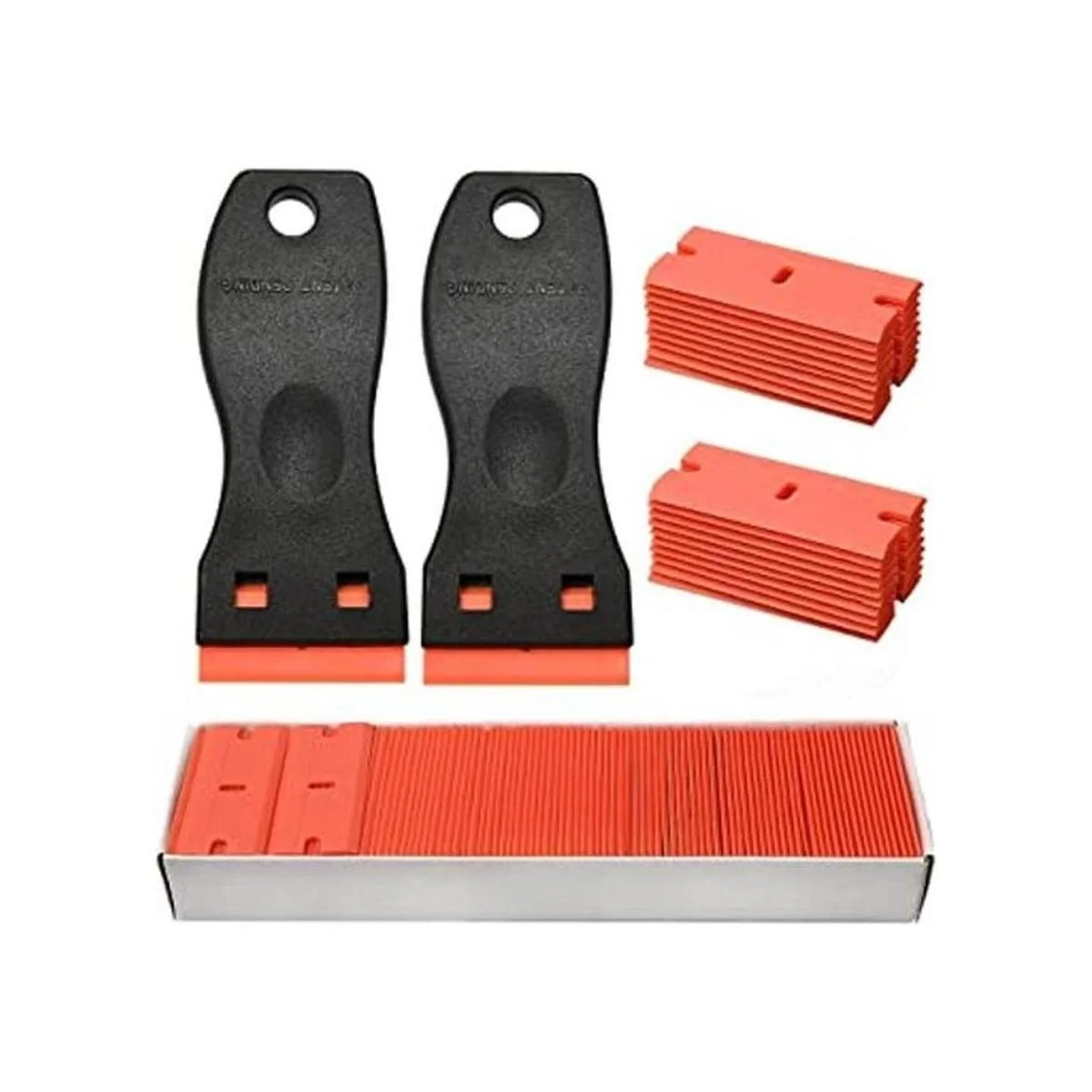 El juego de herramientas rascadoras de calcomanías incluye 120 cuchillas rascadoras de plástico de 1.5 pulgadas 2 rascadoras de plástico para envoltura de vinilo automático, tinte de ventana, limpieza de vidrio, pegamento adhesivo para quitar la pintura de plástico