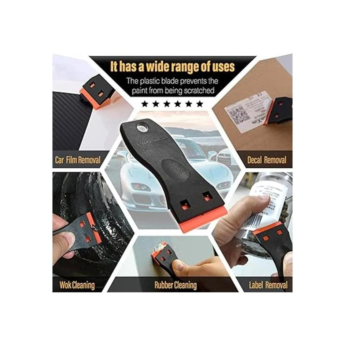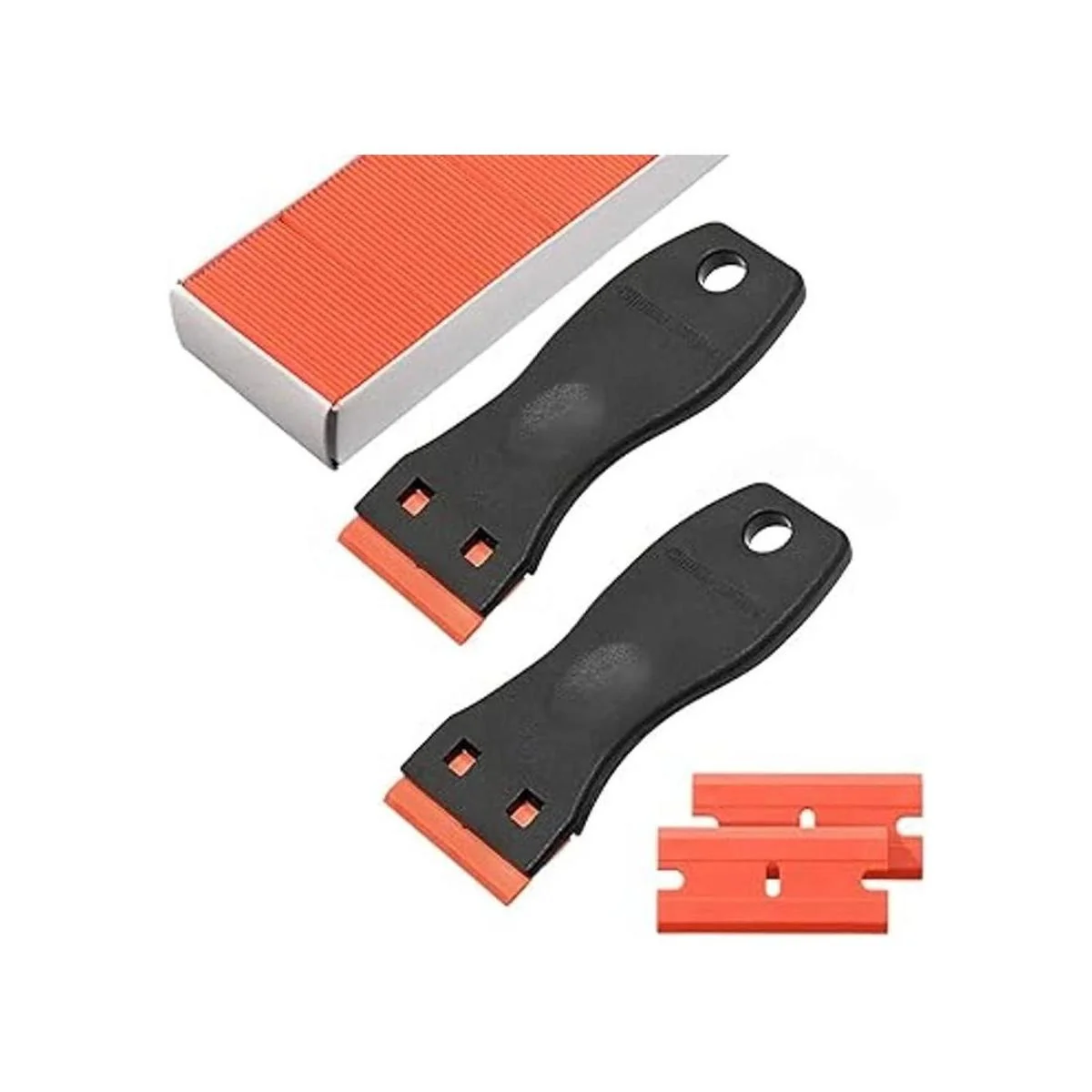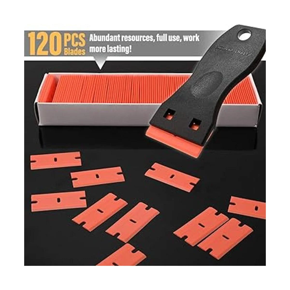 La herramienta raspadora de plástico incluye 2 raspadores de calcomanías y 120 cuchillas de afeitar de plástico de repuesto que te dan más durabilidad y flexibilidad para completar tareas pesadas. El rascador de bordes de plástico funciona en gran medida como un rascador de pintura, rascador de ventana, rascador de vidrio, raspador de vinilo o raspador de suelo en la tarea de limpieza.
