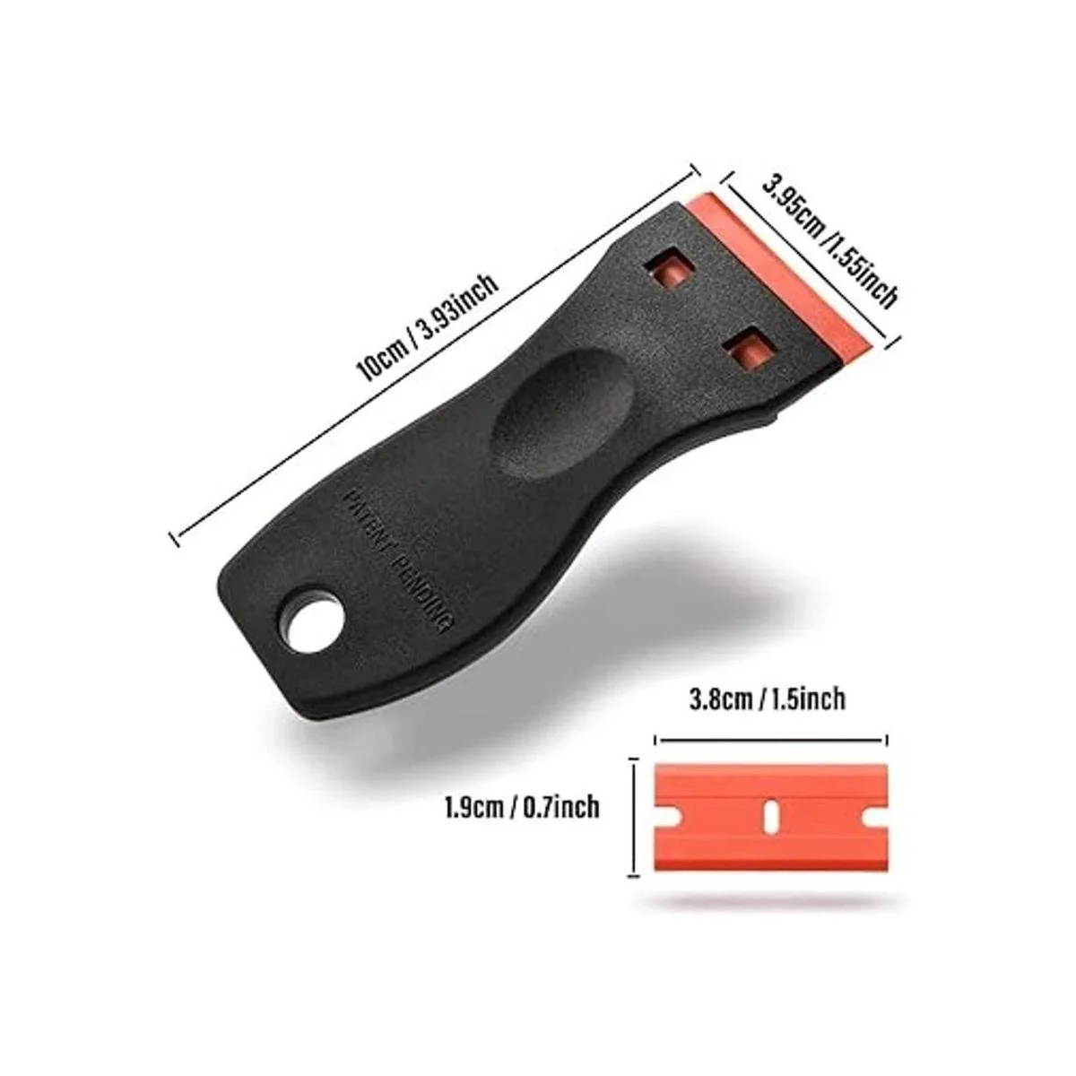 El rascador de cuchillas de afeitar es una herramienta ideal para raspar materiales no deseados de varias superficies. El plástico rígido proporciona resistencia y rigidez hace que la hoja raspadora sea lo suficientemente afilada como para eliminar residuos difíciles. Las cuchillas de afeitar de plástico pueden hacer los mismos trabajos que las cuchillas de acero, pero sin rayar el acabado o dañar los dedos. Un removedor de adhesivos de seguridad para trabajar en vidrio, materiales de cerámica.