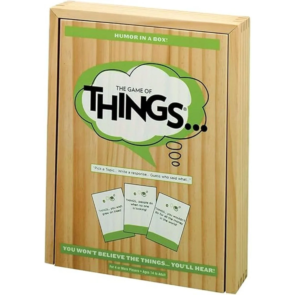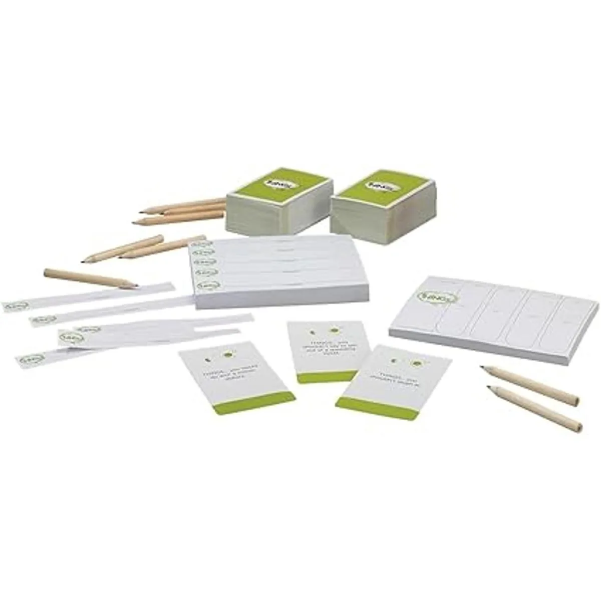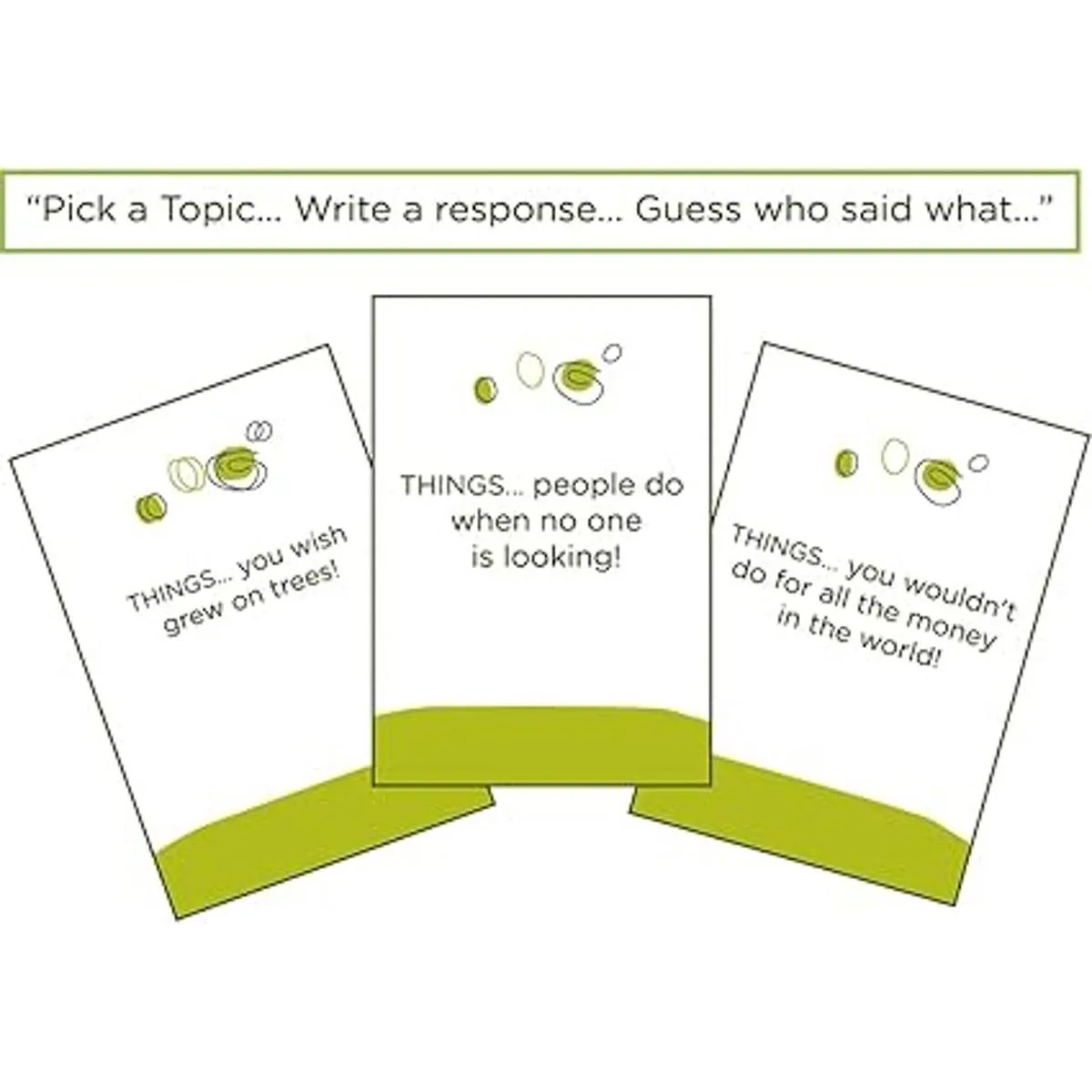 Incluye 300 tarjetas de tema, respuesta Pad, puntuación pad, 8 lápices de colores, instrucciones, todo ello en una caja de madera
