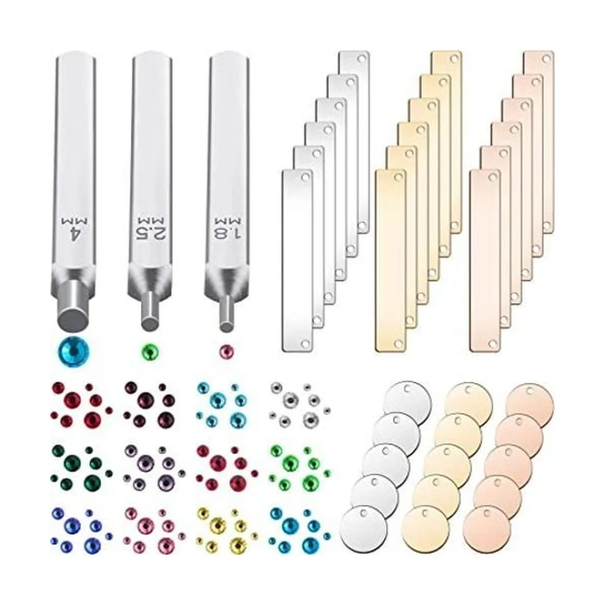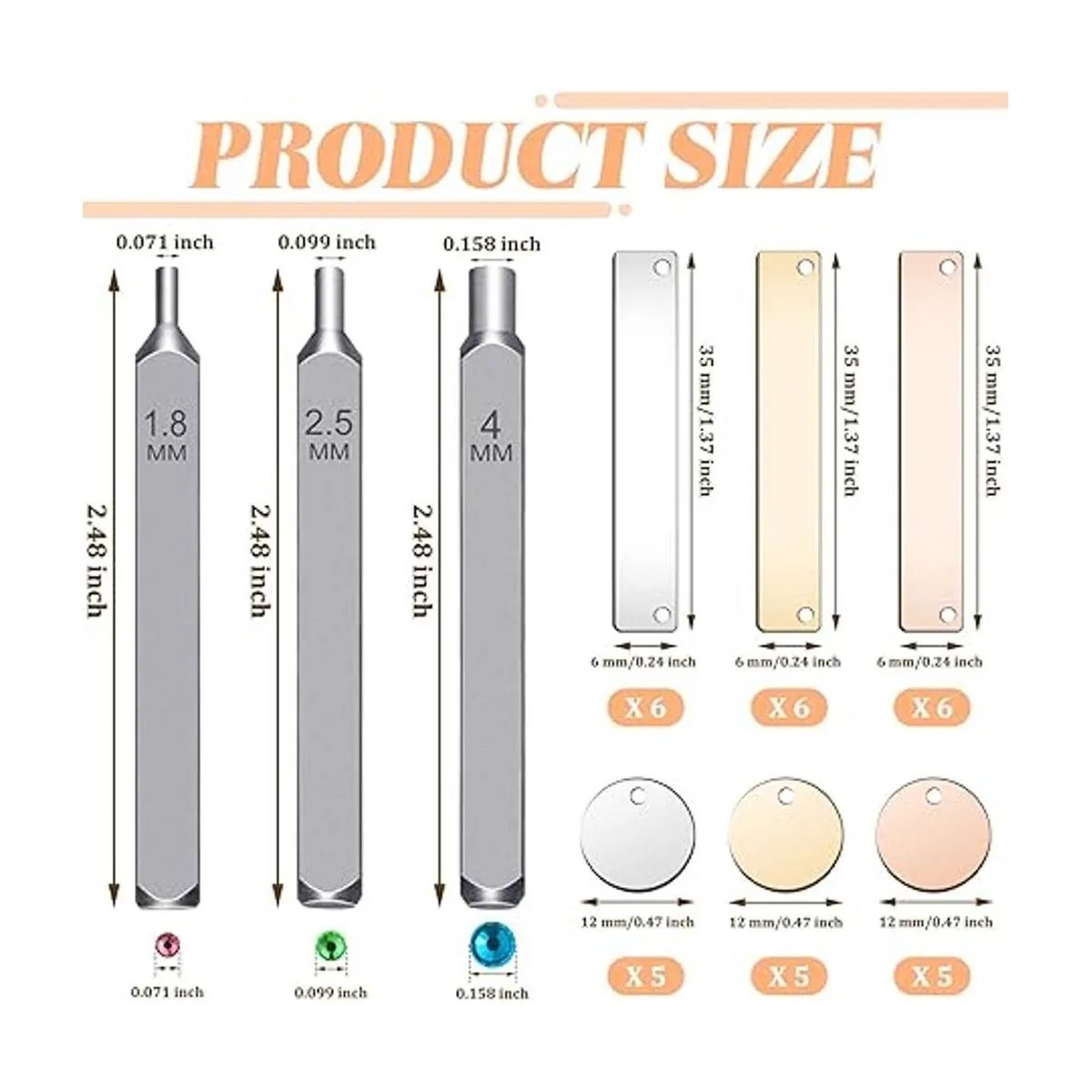 El kit de punzones de metal de Crystal Setter incluye 3 herramientas de estampación de metal de joyería, 1500 diamantes de imitación multicolores, 15 etiquetas redondas en blanco, 15 colgantes rectangulares de barra de estampación para pulseras y collares