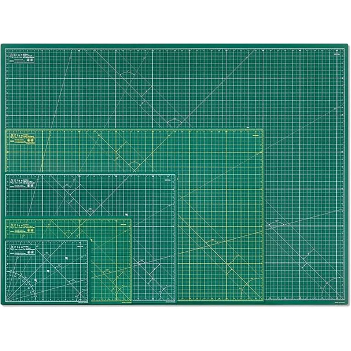 Color y tamaño: la alfombrilla de corte Elan verde tiene dos colores de cuadrícula. La rejilla es amarilla en un lado y blanca en el otro. Las alfombrillas de corte Elan tienen una escala imperial disponible en tamaños A0 35.4 x 47 pulgadas, A1 23.5 x 35.5 pulgadas, A2 18 x 23.5 pulgadas, A3 12 x 17.5 pulgadas, A4 9 x 12 pulgadas.