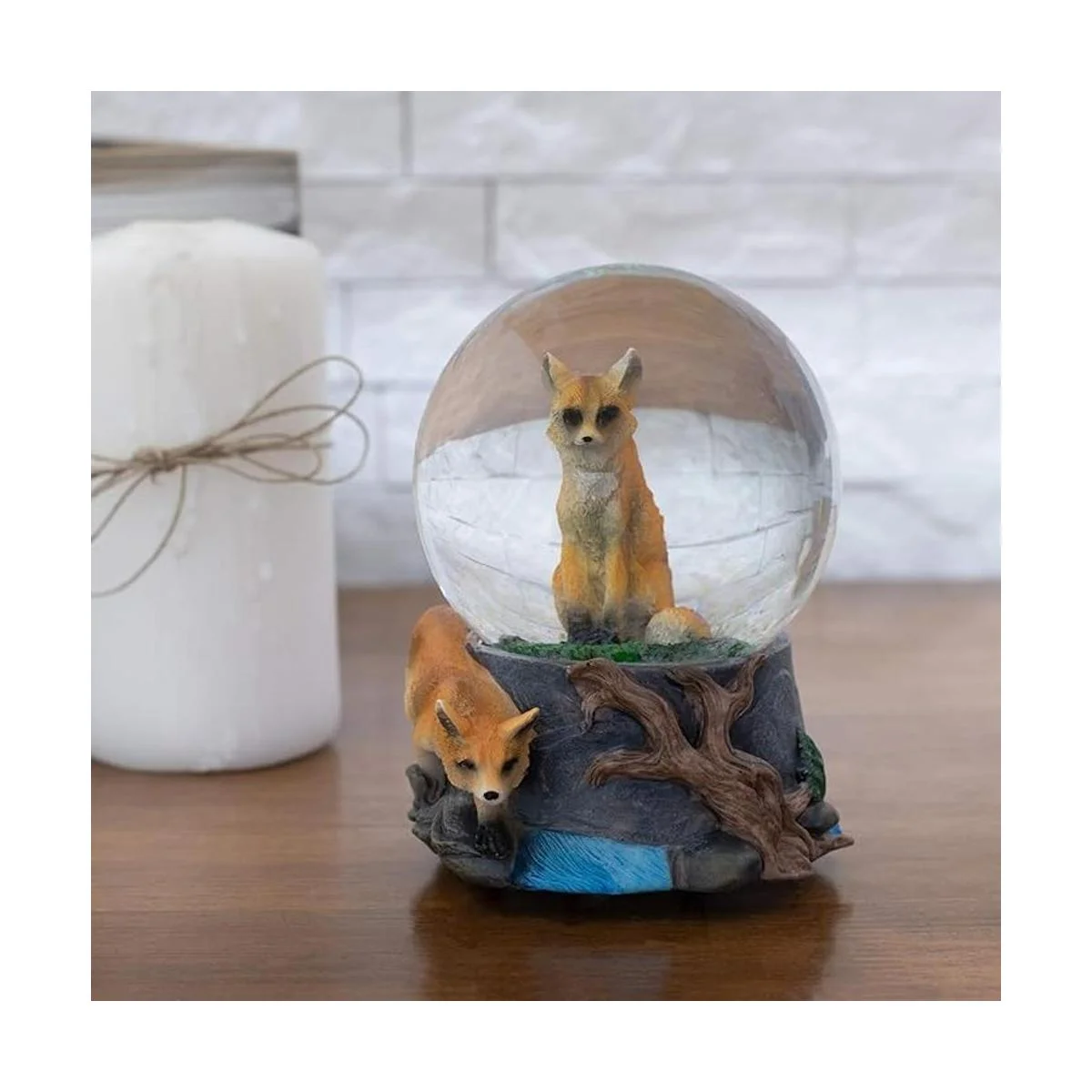 Dimensiones: la figura dentro del globo de agua representa a un zorro rojo sentado y observando. La base del pedestal está hecha de material de piedra de polímero de resina con zorro dimensional que se desliza a través de un bosque.