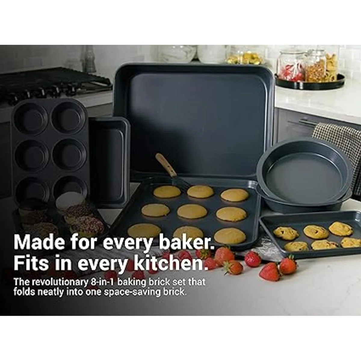 Horneado 8 en 1: el juego de hornear que ahorra espacio incluye todo lo que necesitas para tu cocina: una sartén grande para asar, una de 8 pulgadas. Molde cuadrado para tartas, una pequeña bandeja de horno, dos moldes para magdalenas, dos de 8 pulgadas. latas redondas para tartas y una bandeja grande para horno