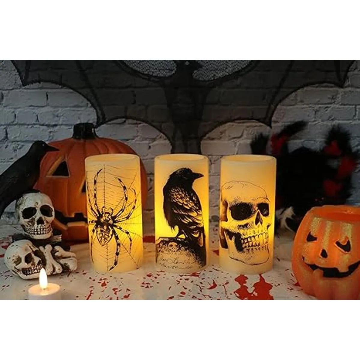 Eldnacele Velas LED parpadeantes sin llama de Halloween con temporizador de 6 horas, velas que parecen de cera, funcionan con pilas, calcomanías variadas