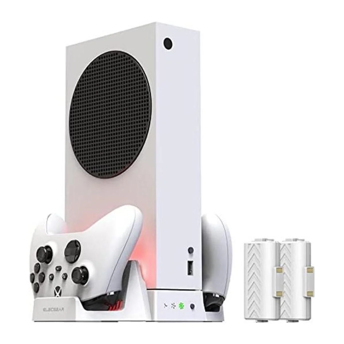 ElecGear Soporte vertical de refrigeración y carga para Xbox Series S, 2 pilas recargables y cargador dual para controlador Xbox, ventilador de refrigeración con luces LED y puerto USB para accesorios de juego