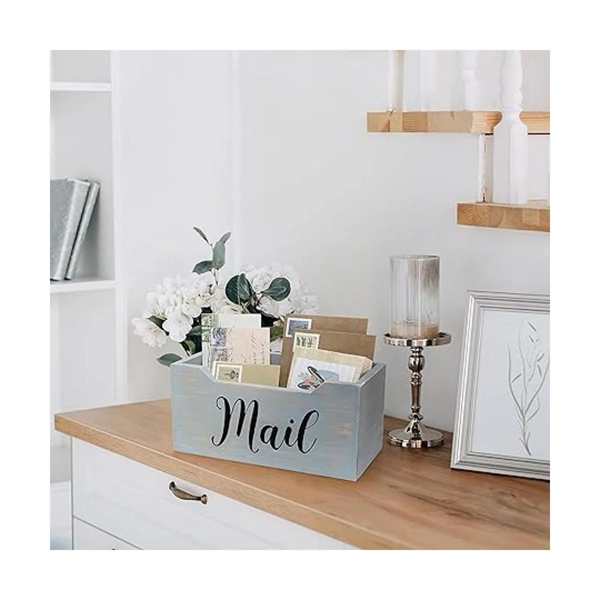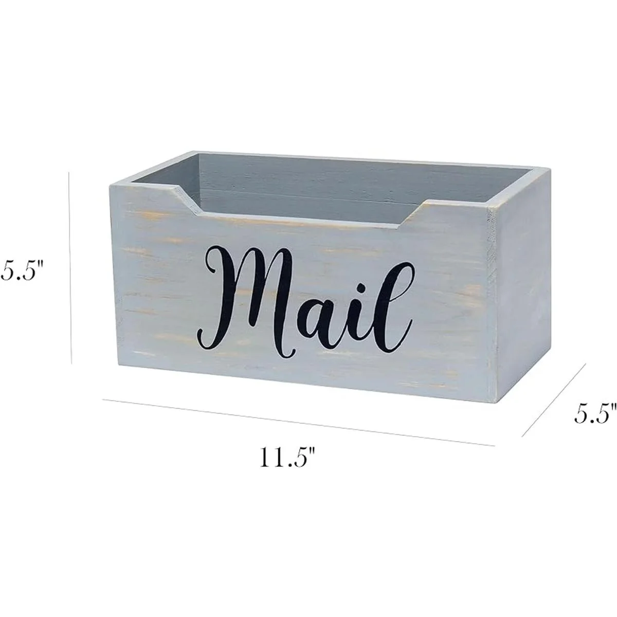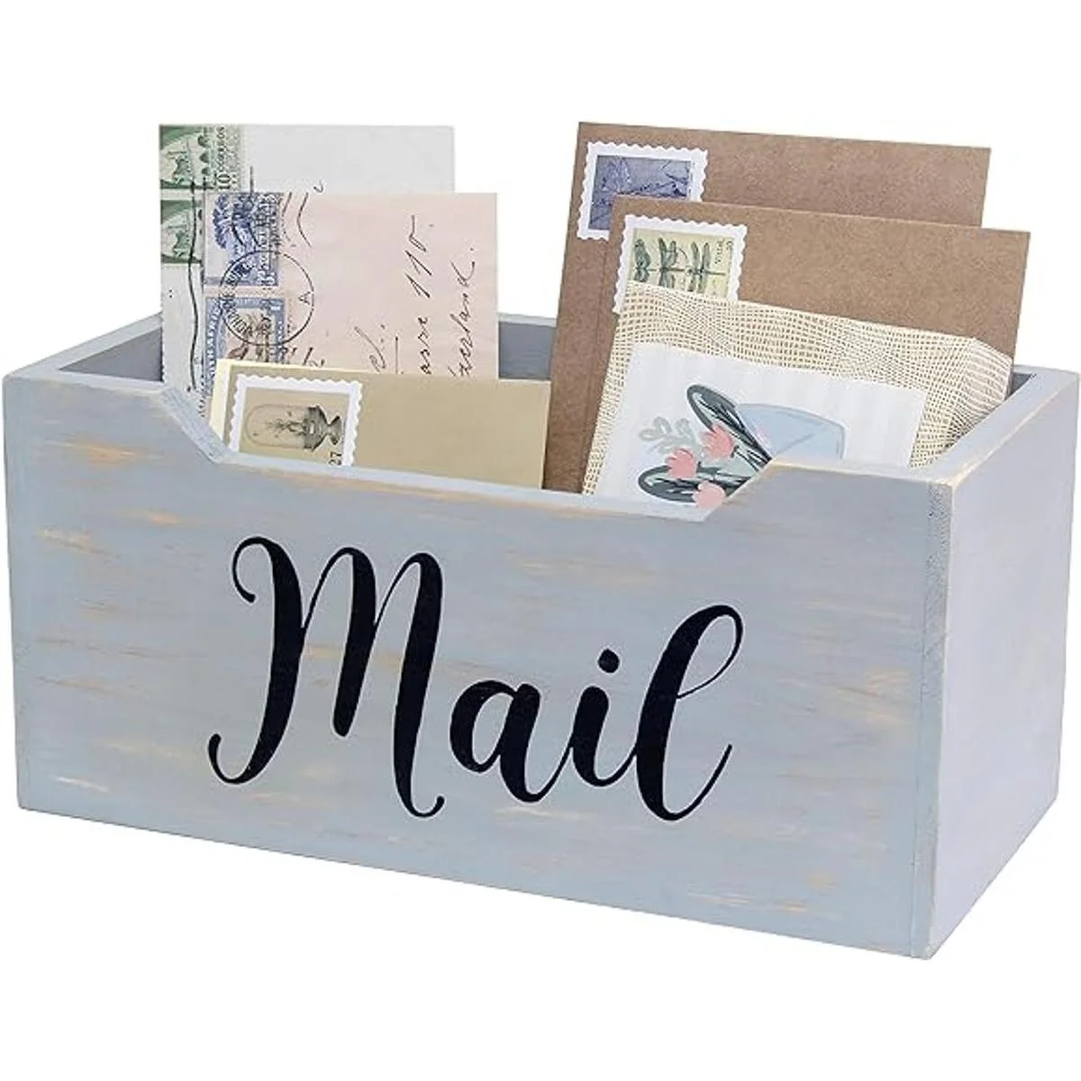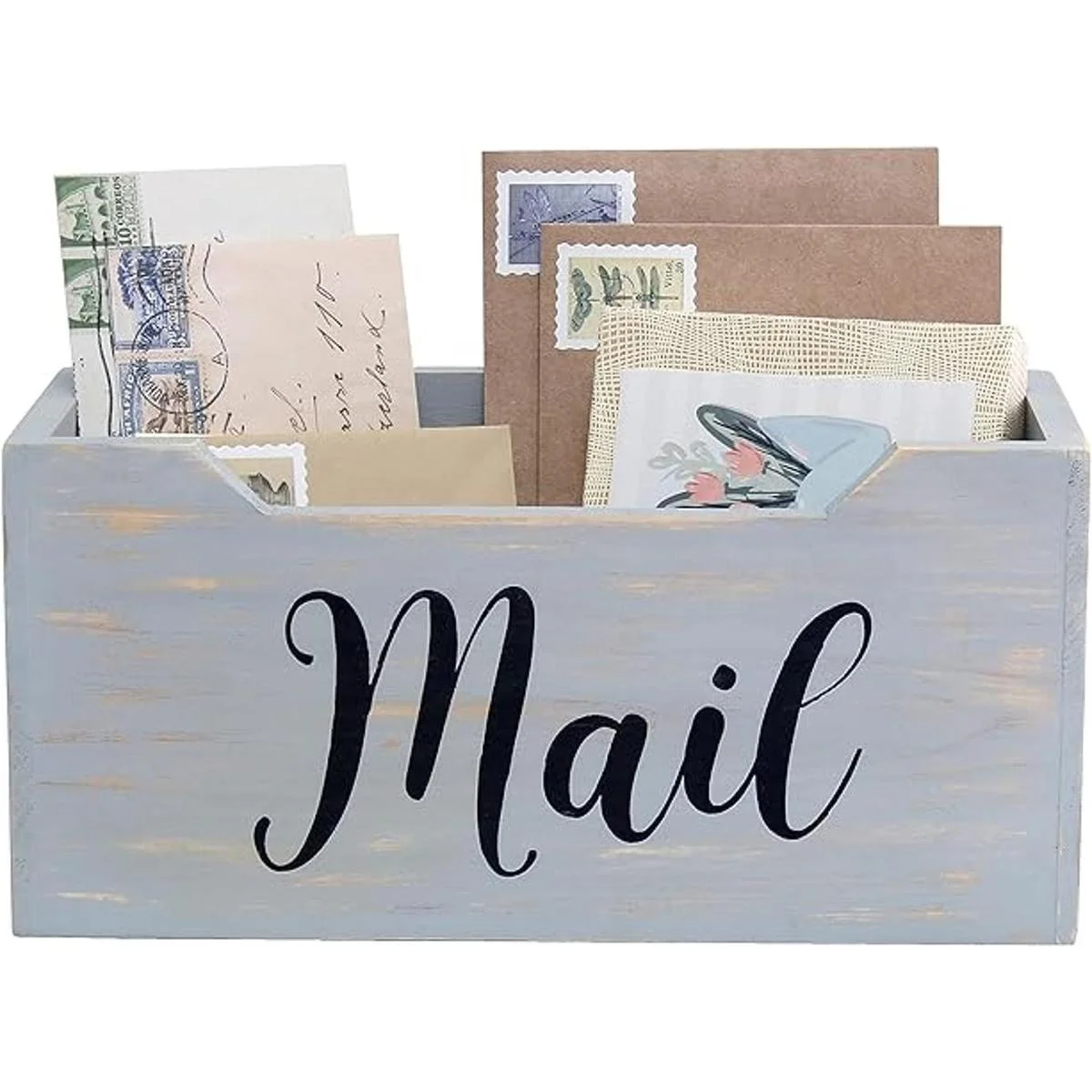 Elegant Designs HG2010GMB Mesa rústica de madera de campo, caja organizadora de correo de palabras con escritura negra, soporte para cartas, accesorios de oficina, decoración de color gris