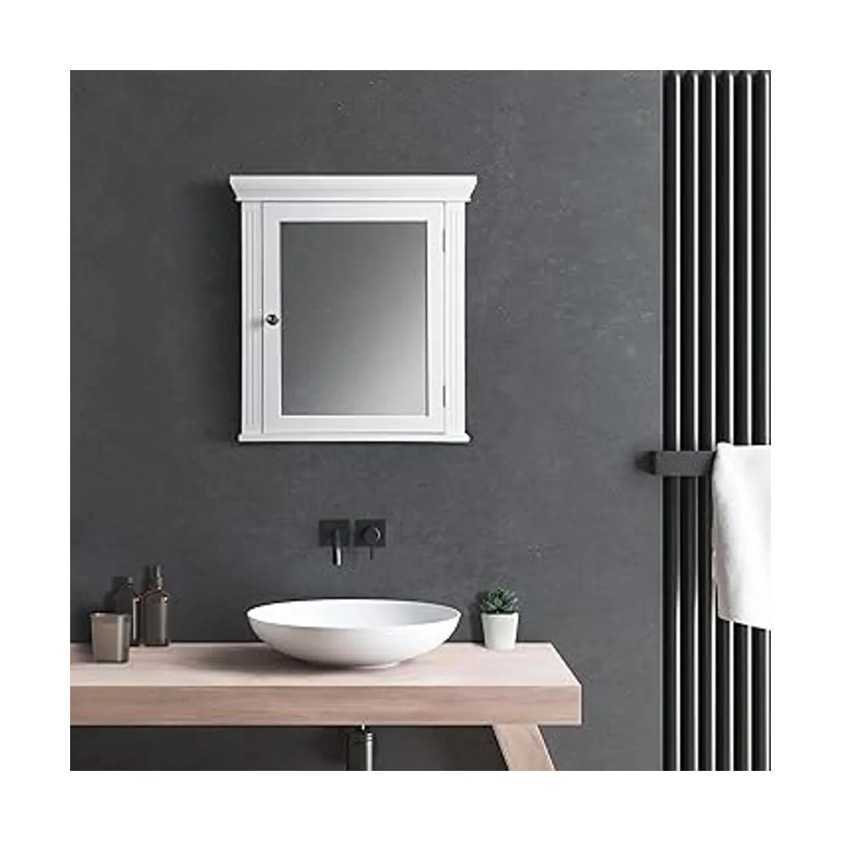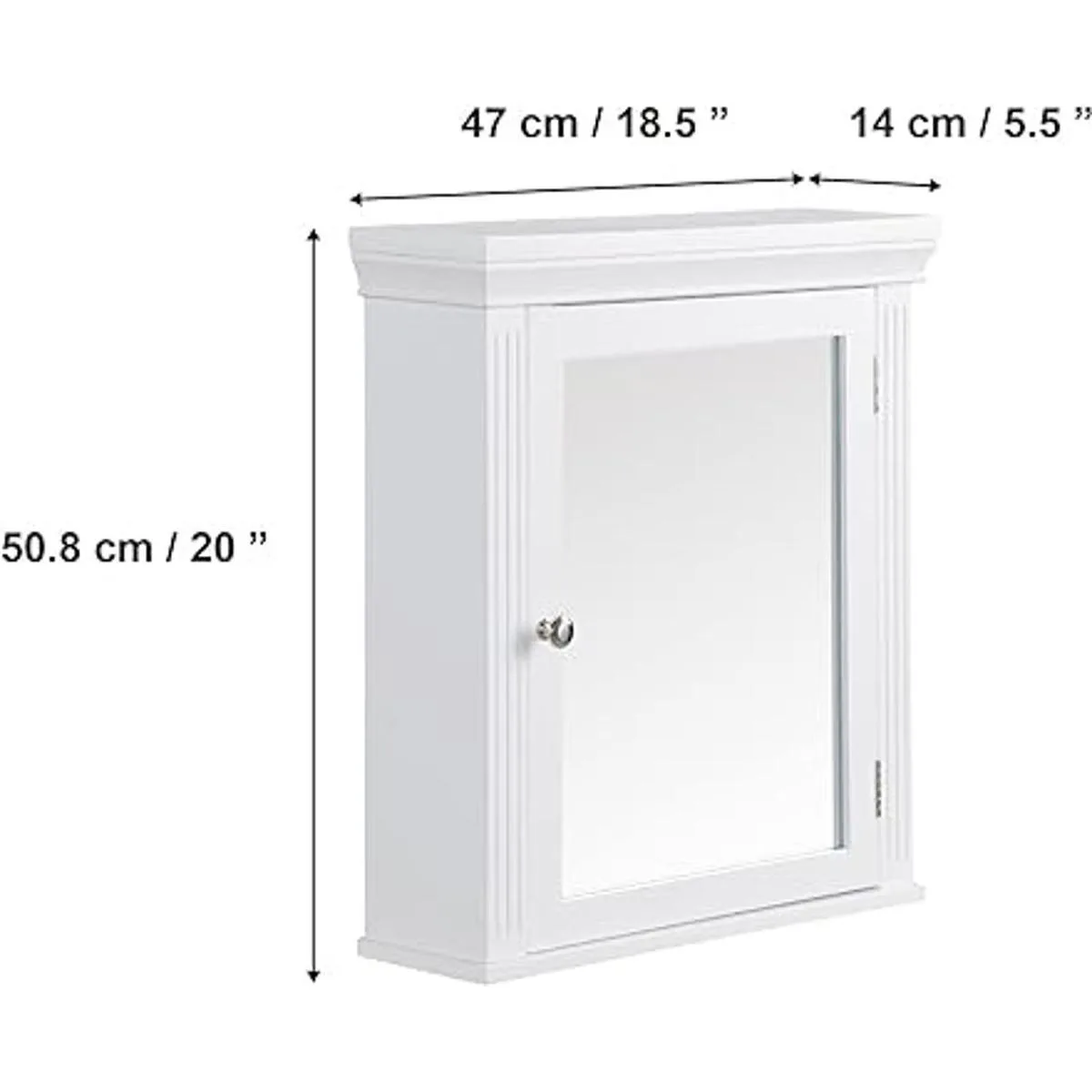 Elegante armario médico: cuenta con un acabado blanco con una parte superior moldeada en corona, una puerta de espejo, pomos de doble chapado y elegantes columnas con 3 ranuras para una hermosa adición a tu espacio