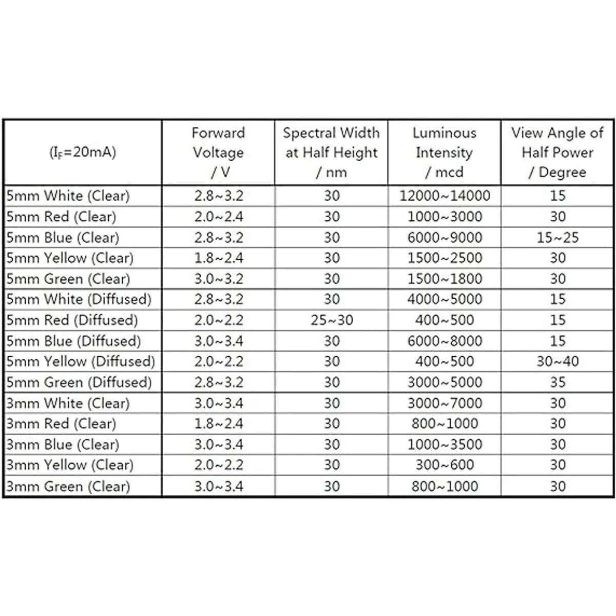 ngulo de visión: 15 30 grados LED transparente. Rango de longitud de onda: 400 630 nm. Corriente nominal positiva 20 mAh, la corriente máxima no supera los 100 mA.
