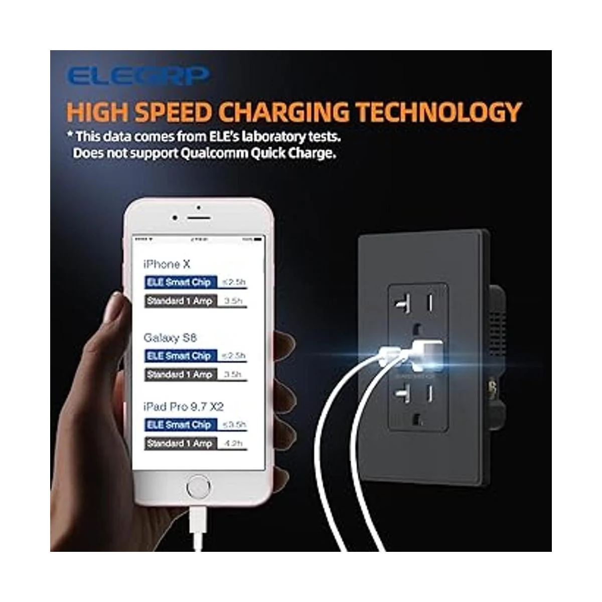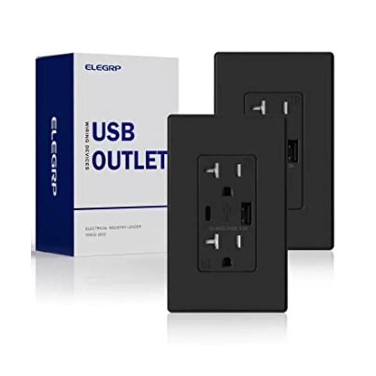 ELEGRP Toma de pared de cargador USB, receptáculo USB con puertos USB tipo A y tipo C, enchufe de receptáculo dúplex resistente a manipulaciones, placa de pared incluida, certificación UL paquete de 2, negro mate