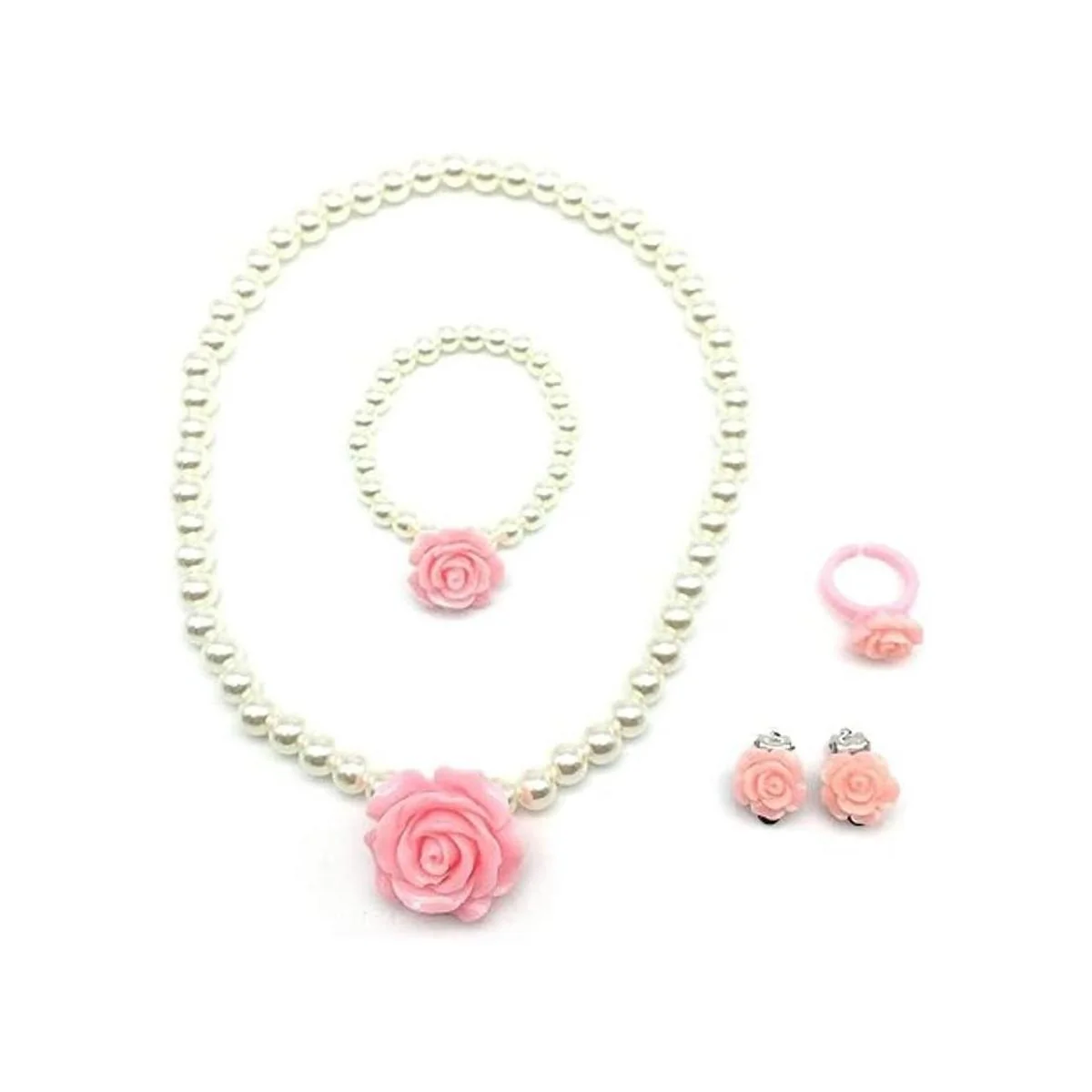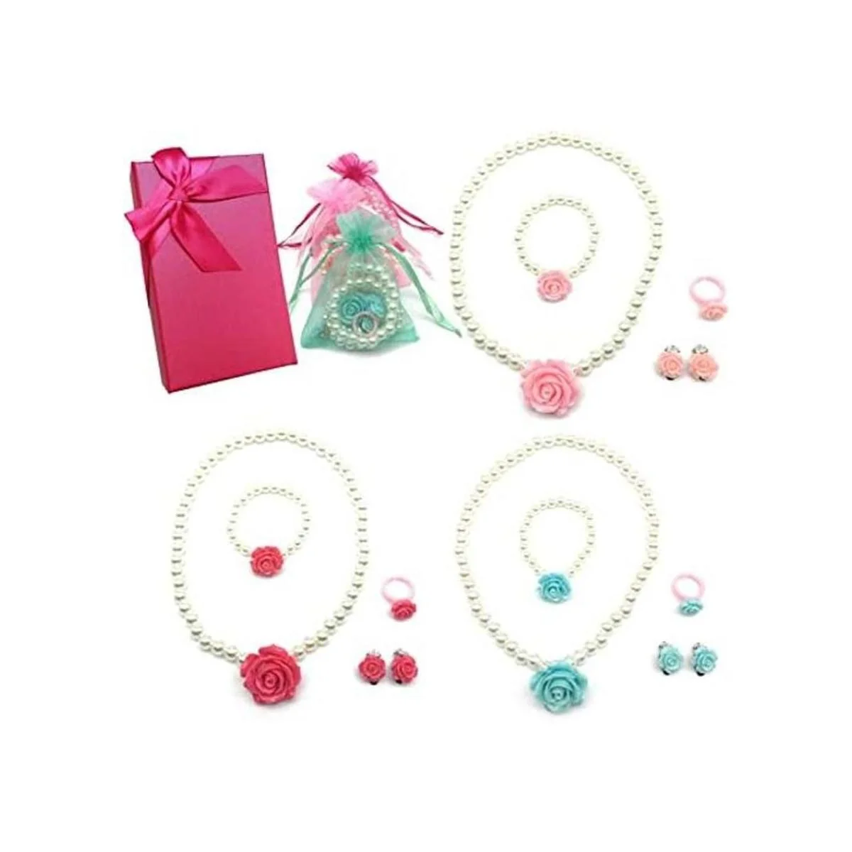Elesa Miracle Girl Party Favor Pretend Play Princesa Rose Pearl Conjunto de collar de joyería de valor collar, pulsera, pendientes, anillos, rosa, rojo, verde