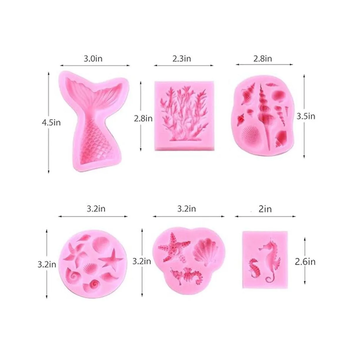 Elfkitwang Molde de silicona para fondant, concha, cola de sirena, caballito de mar, estrella de mar, coral, herramientas de hornear hechas a mano para decoración de tartas de sirena paquete de 6