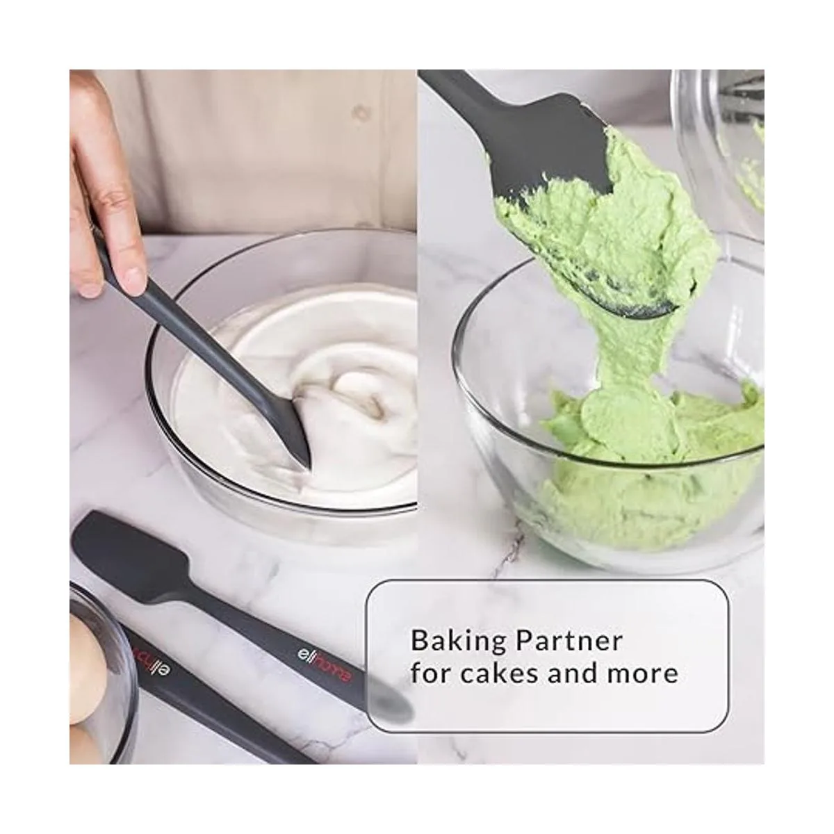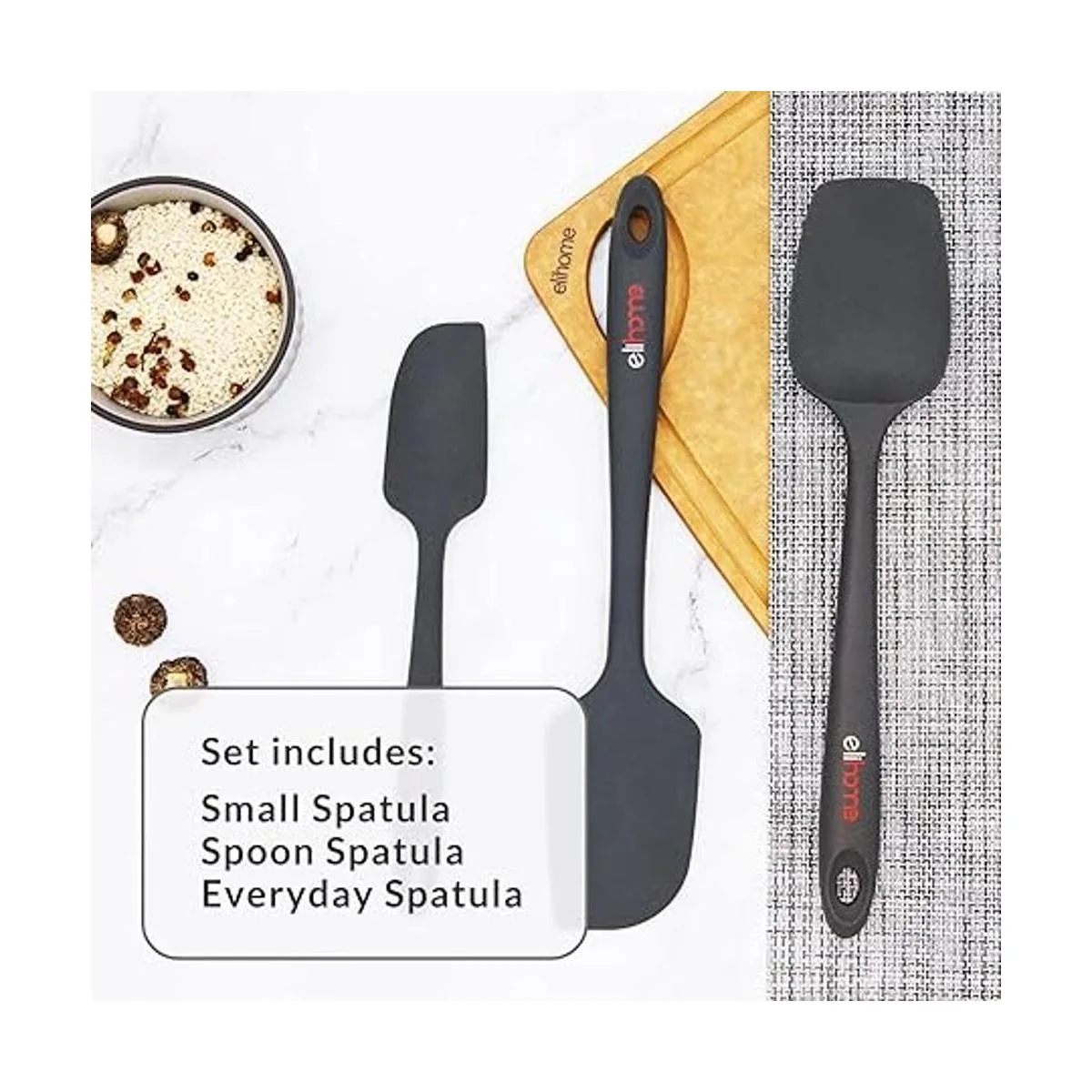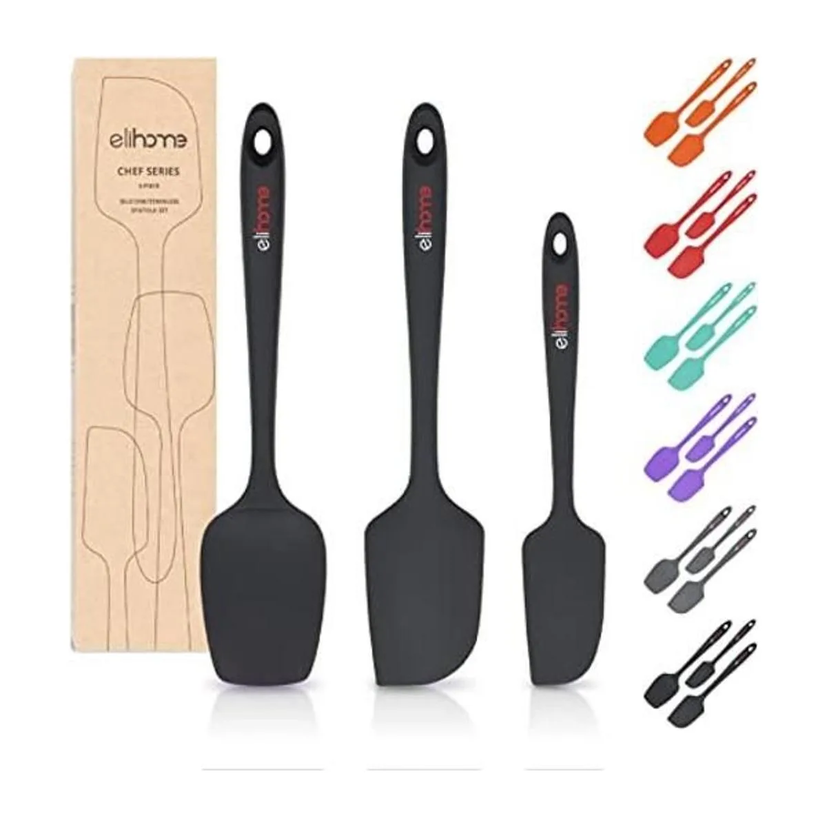Marca prémium: el juego de espátulas de silicona sin costuras Elihome de 3 piezas está hecho con goma de silicona, sin BPA y certificado LFGB. Cada espátula es resistente al calor hasta 600 F, no más espátula derretida.