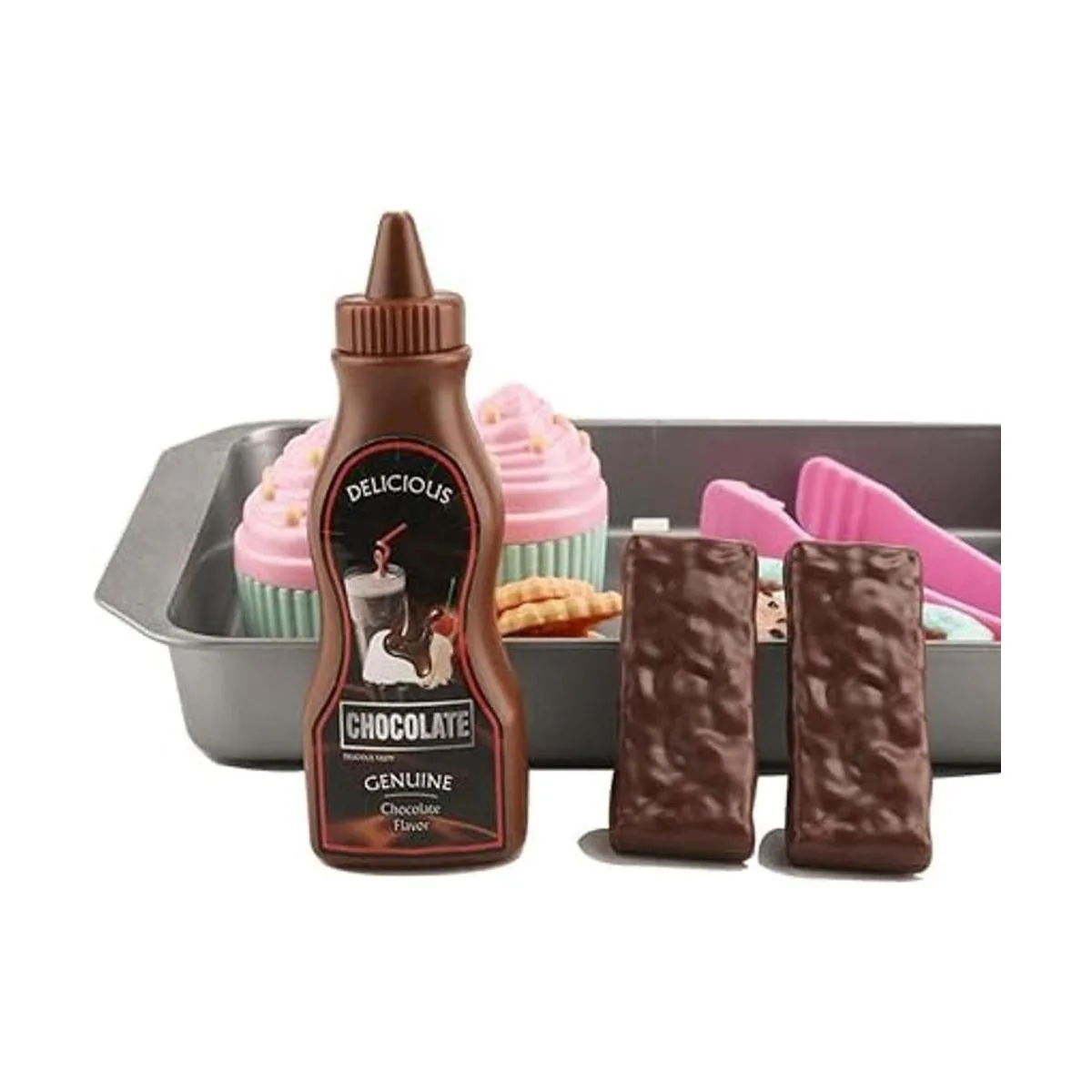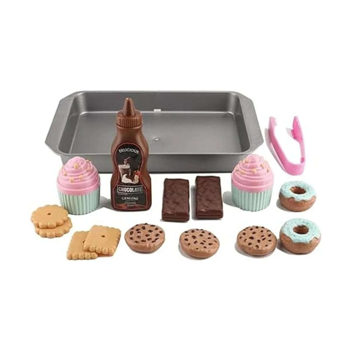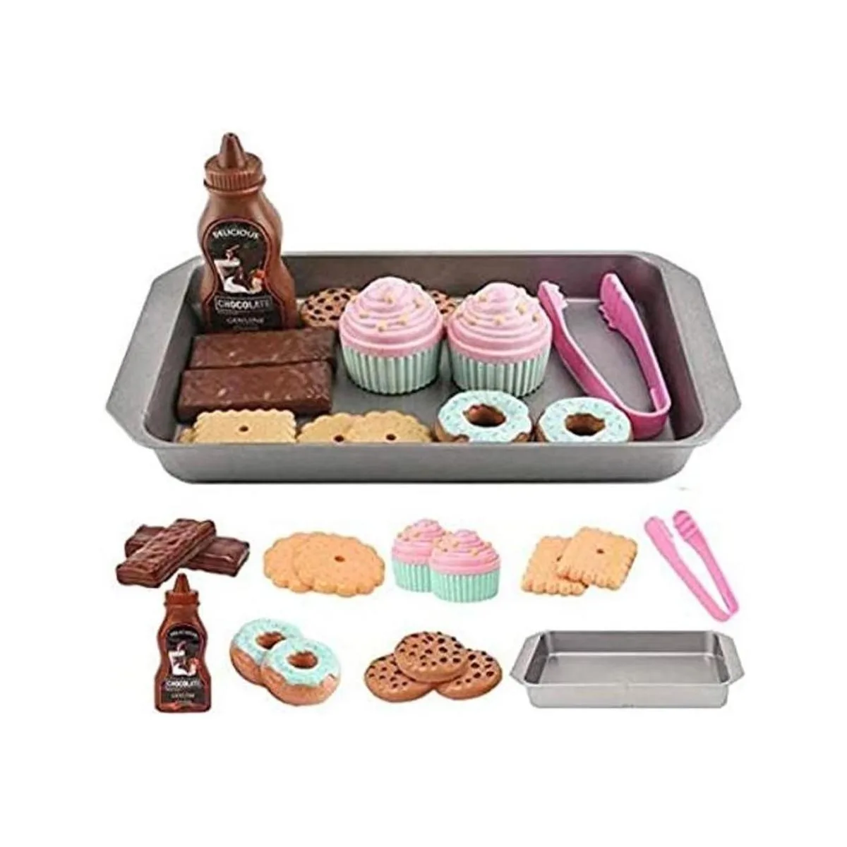 16 piezas de comida de simulación: comida de juego de gran valor para niños, son juegos de juguetes de comida de tamaño perfecto para niños, incluye donas y cupcakes, una bandeja resistente, chocolate, salsa de chocolate, 3 formas diferentes de comida de galletas.