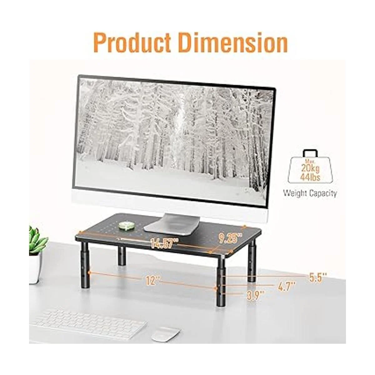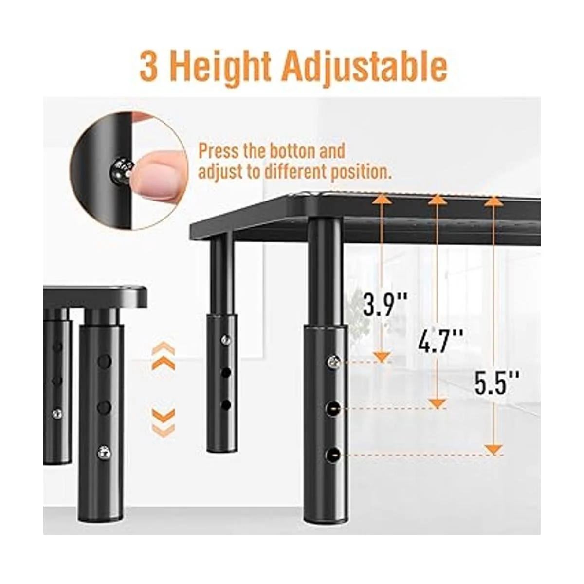 3 ajustes de altura: este elevador de monitor viene con 3 niveles de altura ajustables que se pueden ajustar a 3.9/4.7/5.5. Simplemente pulsa el botón en la pierna y levanta la plataforma para ajustar a diferentes alturas como desees.