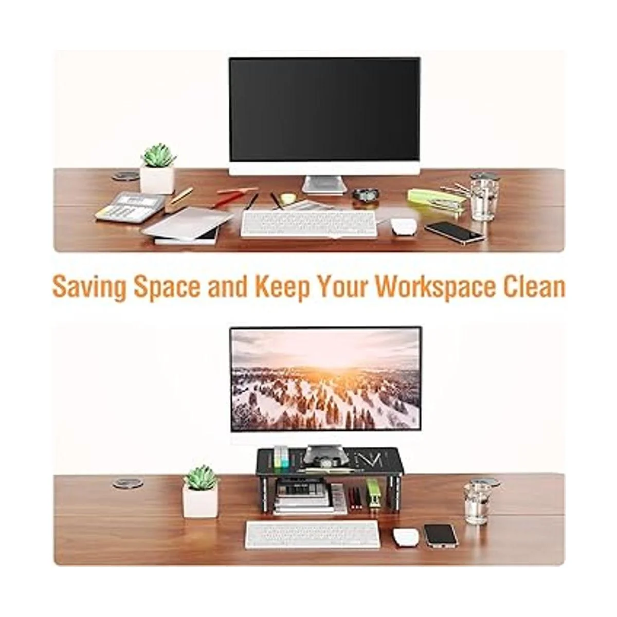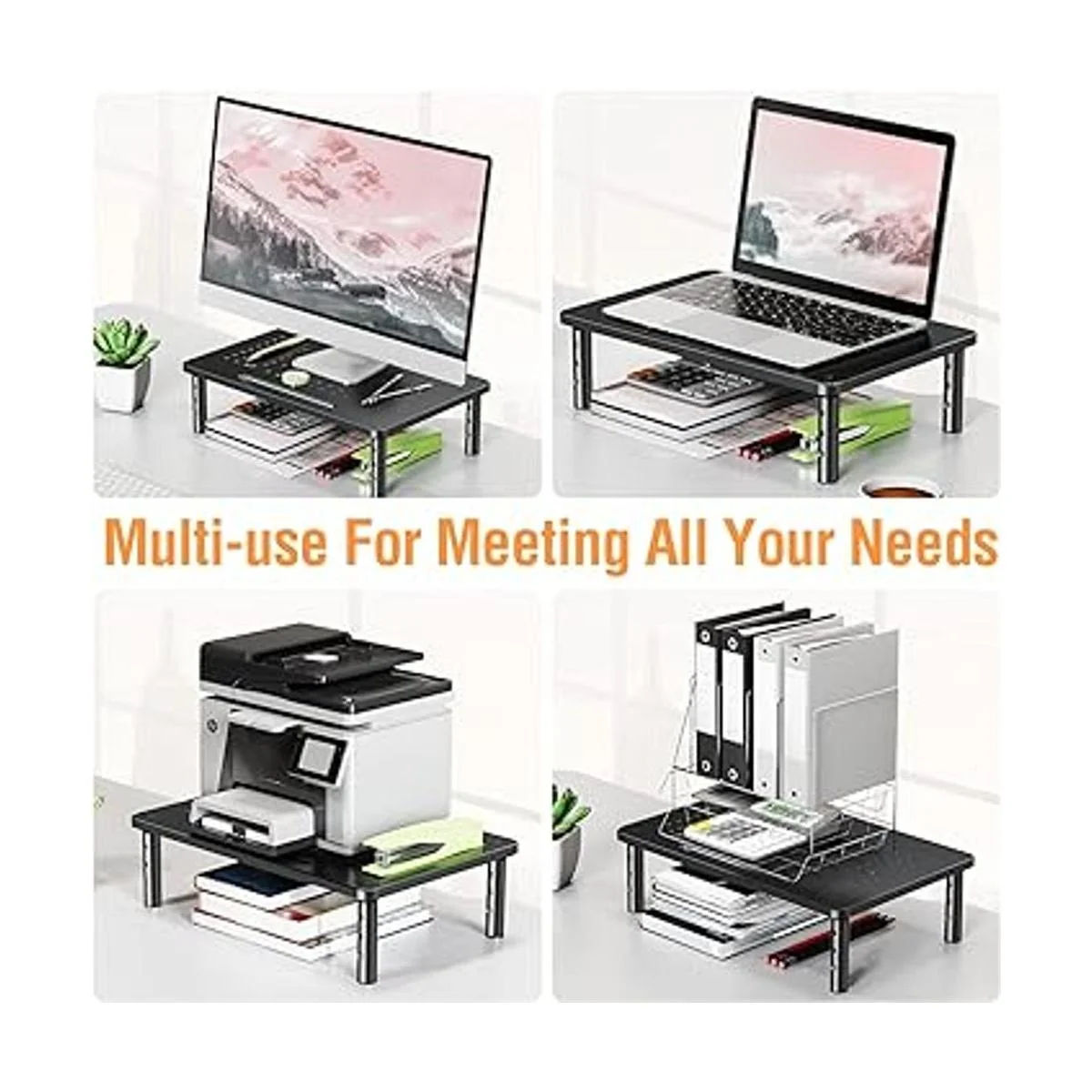 Espacio de trabajo eficiente: apila dos soportes de pantalla juntos para obtener más espacio de almacenamiento mientras que mide 14.6 x 9.2 pulgadas para cada plataforma. Es un elevador de pantalla, pero también un organizador de escritorio para proporcionar espacio adicional para tus artículos de oficina. Mantén todo en orden y mantén un escritorio más limpio.