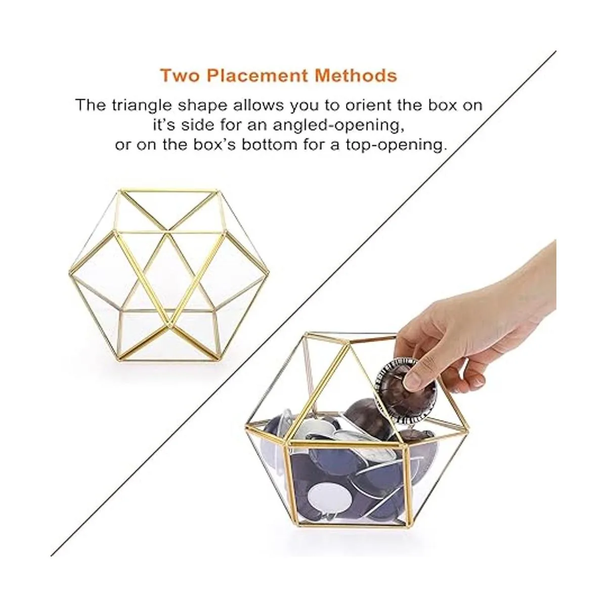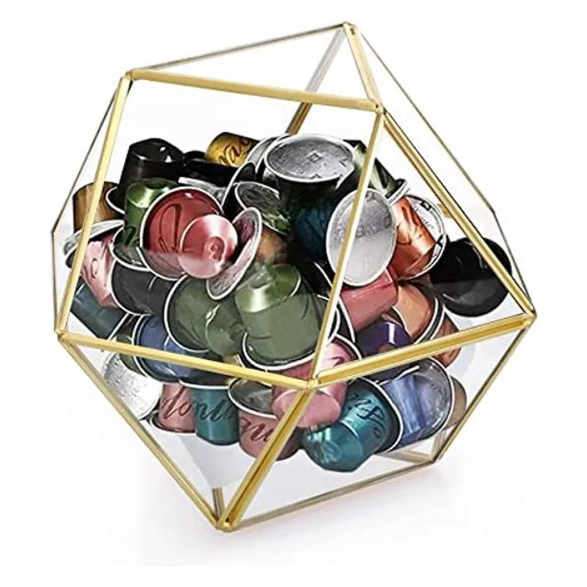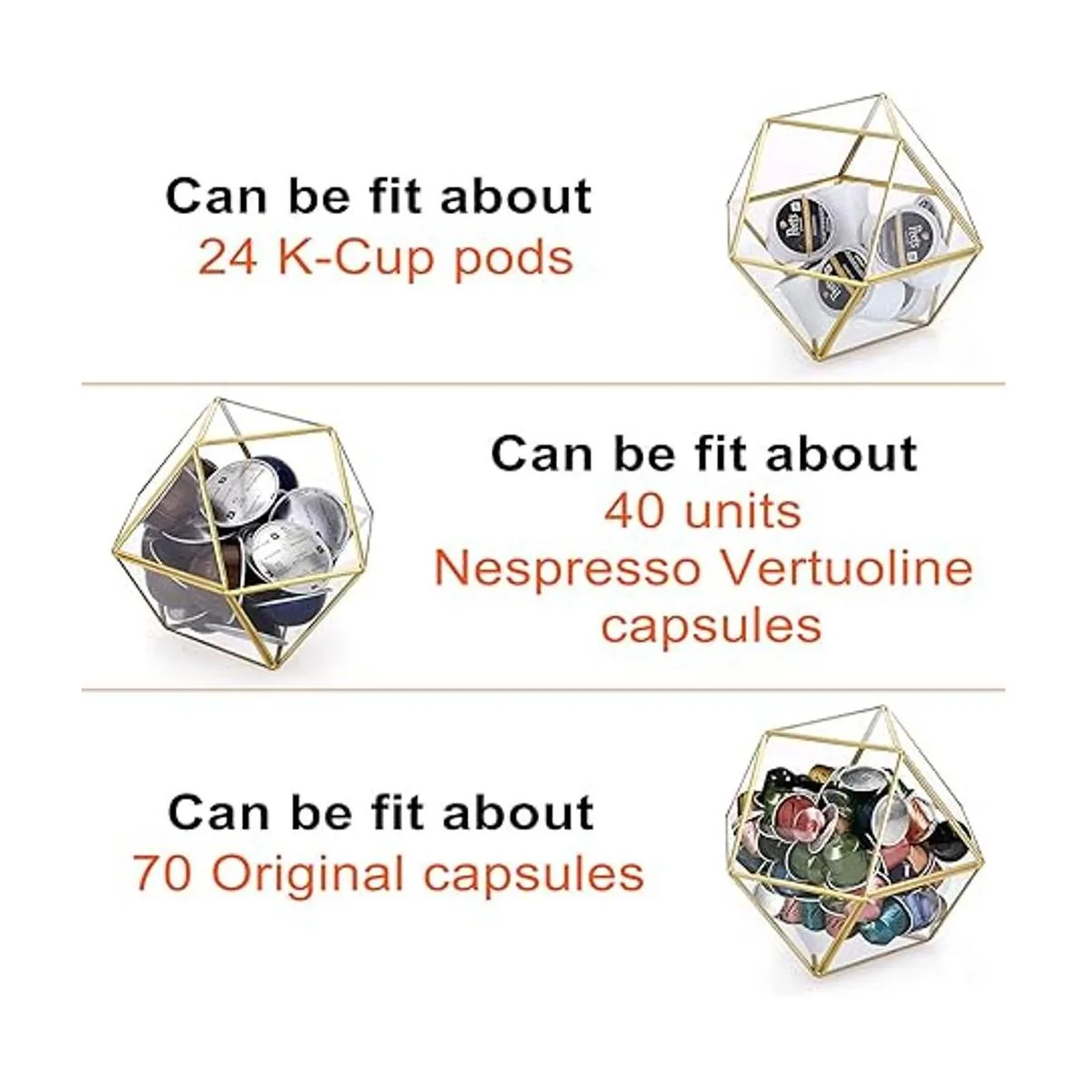 Diseño único: este organizador de cápsulas de café viene en un diseño de caja de vidrio de 14 lados con borde dorado incrustado, y el diseño único se convierte en una decoración indispensable en tu hogar